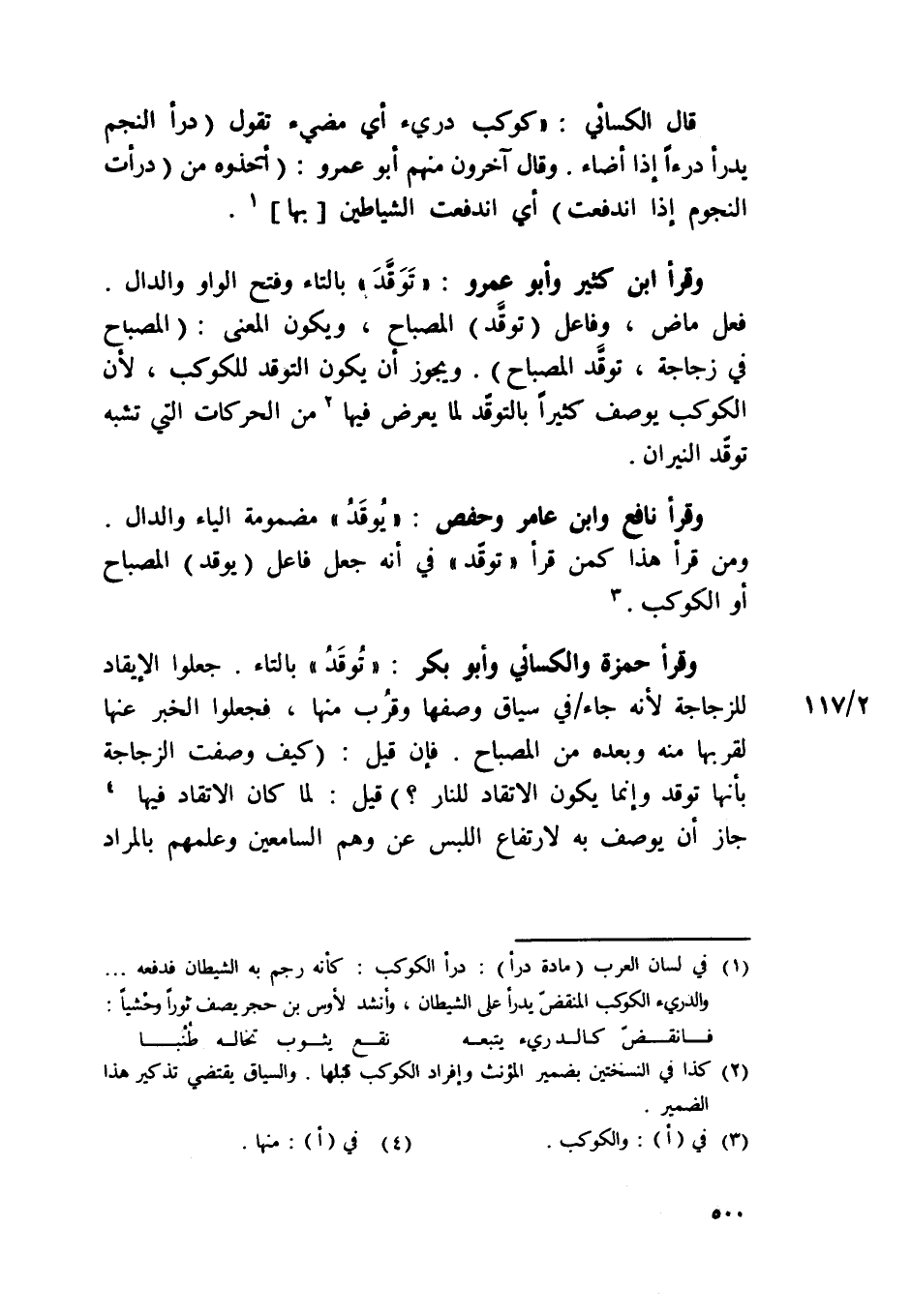 وَقَرَأَ ابْن كثير وَأَبُو عَمْرو / توقد / بِالتَّاءِ وَفتح الْوَاو وَالدَّال فعل مَاض وفاعل توقد الْمِصْبَاح وَيكون الْمَعْنى الْمِصْبَاح فِي زجاجة توقد الْمِصْبَاح وَيجوز أَن يكون التوقد للكوكب لِأَن الْكَوْكَب يُوصف كثيرا بالتوقد لما يعرض فِيهَا من الحركات الَّتِي تشبه توقد النيرَان