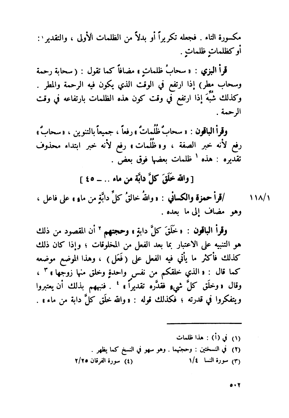 قَرَأَ حَمْزَة وَالْكسَائِيّ وَالله خَالق كل دَابَّة من مَاء على فَاعل وَهُوَ مُضَاف إِلَى مَا بعده