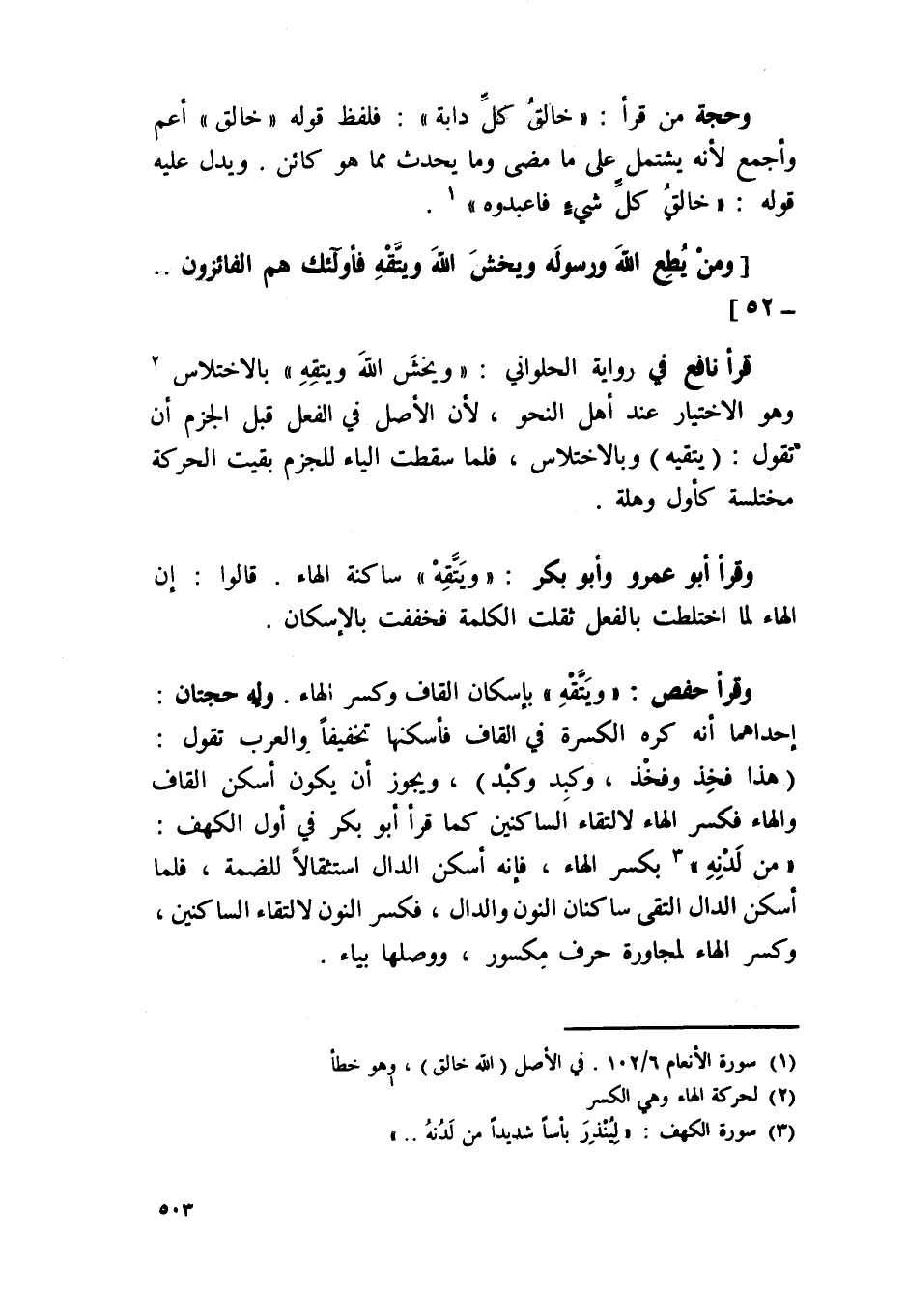 وَقَرَأَ حَفْص ويتقه بِإِسْكَان الْقَاف وَكسر الْهَاء وَله حجتان إِحْدَاهمَا أَنه كره الكسرة فِي الْقَاف فأسكنها تَخْفِيفًا وَالْعرب تَقول هَذَا فَخذ وفخذ وكبد وكبد وَيجوز أَن يكون أسكن الْقَاف وَالْهَاء فَكسر الْهَاء لالتقاء الساكنين كَمَا قَرَأَ أَبُو بكر فِي أول الْكَهْف {من لَدنه} بِكَسْر الْهَاء فَإِنَّهُ أسكن الدَّال استثقالا للضمة فَلَمَّا أسكن الدَّال التقى ساكنان النُّون وَالدَّال فَكسر النُّون لالتقاء الساكنين وَكسر الْهَاء لمجاورة حرف مكسور وَوَصلهَا بياء