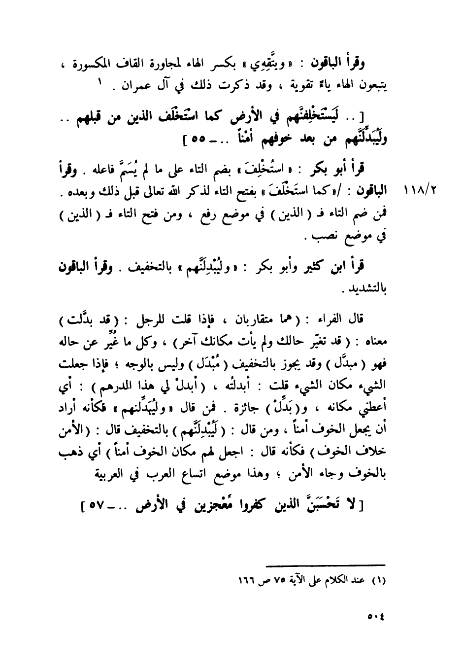 قَرَأَ أَبُو بكر {اسْتخْلف} بِضَم التَّاء على مَا لم يسم فَاعله وَقَرَأَ الْبَاقُونَ كَمَا اسْتخْلف بِفَتْح التَّاء لذكر الله تَعَالَى قبل ذَلِك وَبعده فَمن ضم التَّاء ف الَّذين فِي مَوضِع رفع وَمن فتح التَّاء ف الَّذين فِي مَوضِع نصب