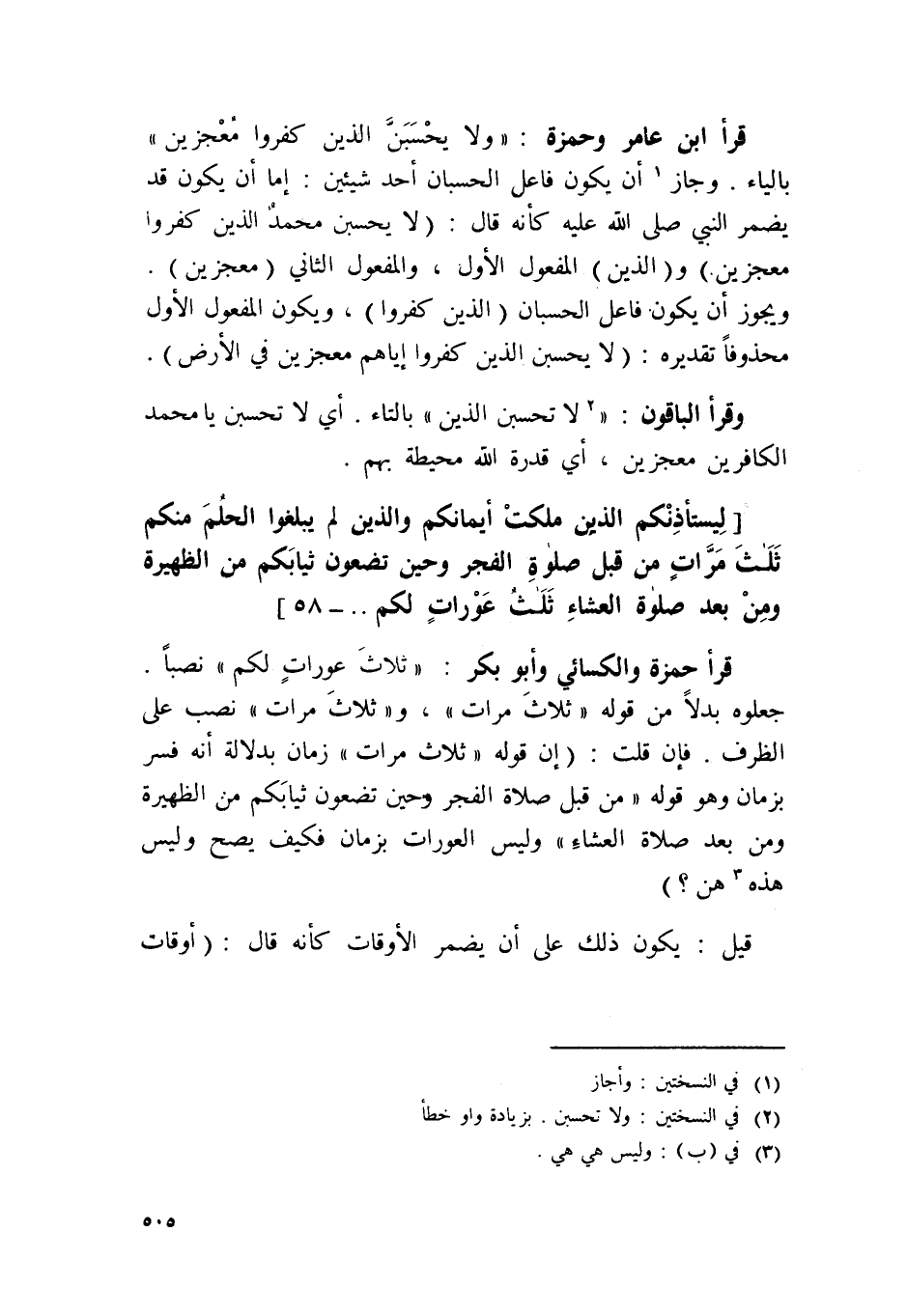 قَرَأَ ابْن عَامر وَحَمْزَة / وَلَا يَحسبن الَّذين كفرُوا معجزين / بِالْيَاءِ وَجَاز أَن يكون فَاعل الحسبان أحد شَيْئَيْنِ إِمَّا أَن يكون قد يضمر النَّبِي صلى الله عَلَيْهِ كَأَنَّهُ قَالَ لَا يَحسبن مُحَمَّد الَّذين كفرُوا معجزين وَالَّذين الْمَفْعُول الأول والمعفول الثَّانِي معجزين وَيجوز أَن يكون فَاعل الحسبان الَّذين كفرُوا وَيكون الْمَفْعُول الأول محذوفا تَقْدِيره لَا يَحسبن الَّذين كفرُوا إيَّاهُم معجزين فِي الأَرْض