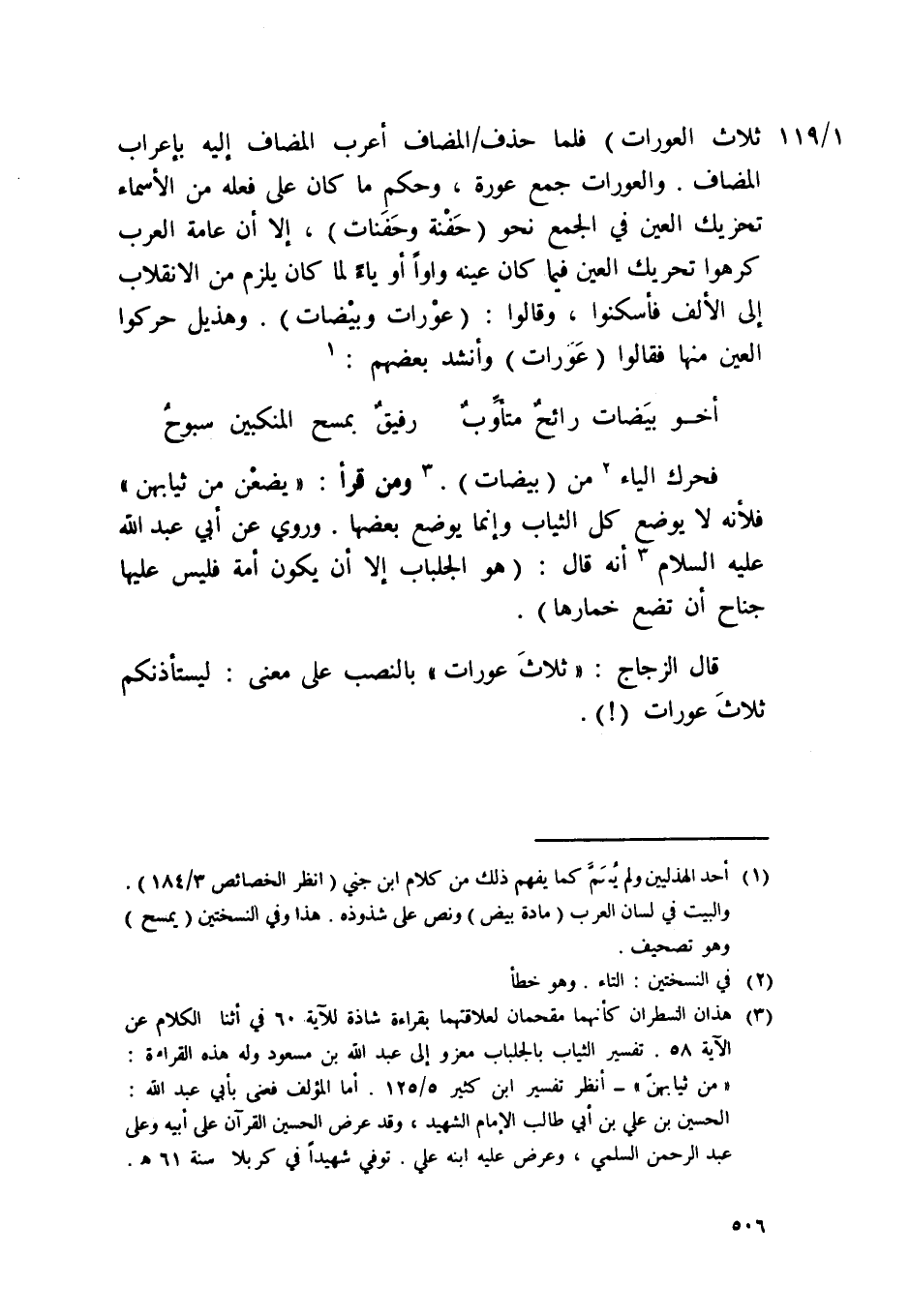 ثَلَاث العورات فَلَمَّا حذف الْمُضَاف أعرب الْمُضَاف إِلَيْهِ بإعراب الْمُضَاف والعورات جمع عَورَة وَحكم مَا كَانَ على فعله من الْأَسْمَاء تَحْرِيك الْعين فِي الْجمع نَحْو حفْنَة وحفنات إِلَّا أَن عَامَّة الْعَرَب كَرهُوا تَحْرِيك الْعين فِيمَا كَانَ عينه واوا أَو يَاء لما كَانَ يلْزم من الانقلاب إِلَى الْألف فأسكنوا وَقَالُوا عورات وبيضات وهذيل حركوا الْعين مِنْهَا فَقَالُوا عورات وَأنْشد عبهضم ... أَخُو بيضات رائح متأوب ... رَفِيق بمسح الْمَنْكِبَيْنِ سبوح ...