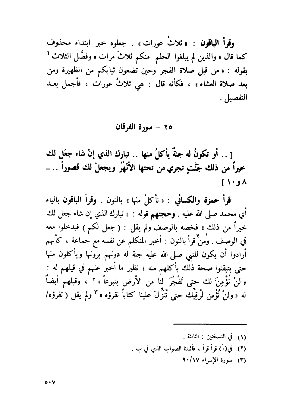 قَرَأَ حَمْزَة وَالْكسَائِيّ {نَأْكُل مِنْهَا} بالنُّون وَقَرَأَ الْبَاقُونَ بِالْيَاءِ أَي مُحَمَّد صلى الله عَلَيْهِ وحجتهم قَوْله {تبَارك الَّذِي إِن شَاءَ جعل لَك خيرا من ذَلِك} فخصه بِالْوَصْفِ وَلم يقل جعل لكم فيدخلوا مَعَه فِي الْوَصْف وَمن قَرَأَ بالنُّون أخبر الْمُتَكَلّم عَن نَفسه مَعَ جمَاعَة كَأَنَّهُمْ أَرَادوا أَن يكون للنَّبِي صلى الله عَلَيْهِ جنَّة لَهُ دونهم يرونها ويأكلون مِنْهَا حَتَّى يتيقنوا صِحَة ذَلِك بأكلهم مِنْهُ نَظِير مَا أخبر عَنْهُم فِي قيلهم لَهُ {لن نؤمن لَك حَتَّى تفجر لنا من الأَرْض ينبوعا} وقيلهم أَيْضا لَهُ {وَلنْ نؤمن لرقيك حَتَّى تنزل علينا كتابا نقرؤه} وَلم يقل تقرؤه