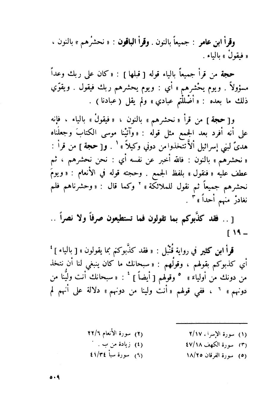 حجَّة من قَرَأَ جَمِيعًا بِالْيَاءِ قَوْله قبلهَا {كَانَ على رَبك وَعدا مسؤولا وَيَوْم يحشرهم} أَي وَيَوْم يحشرهم رَبك فَيَقُول وَيُقَوِّي ذَلِك مَا بعده {أضللتم عبَادي} وَلم يقل عبادنَا
