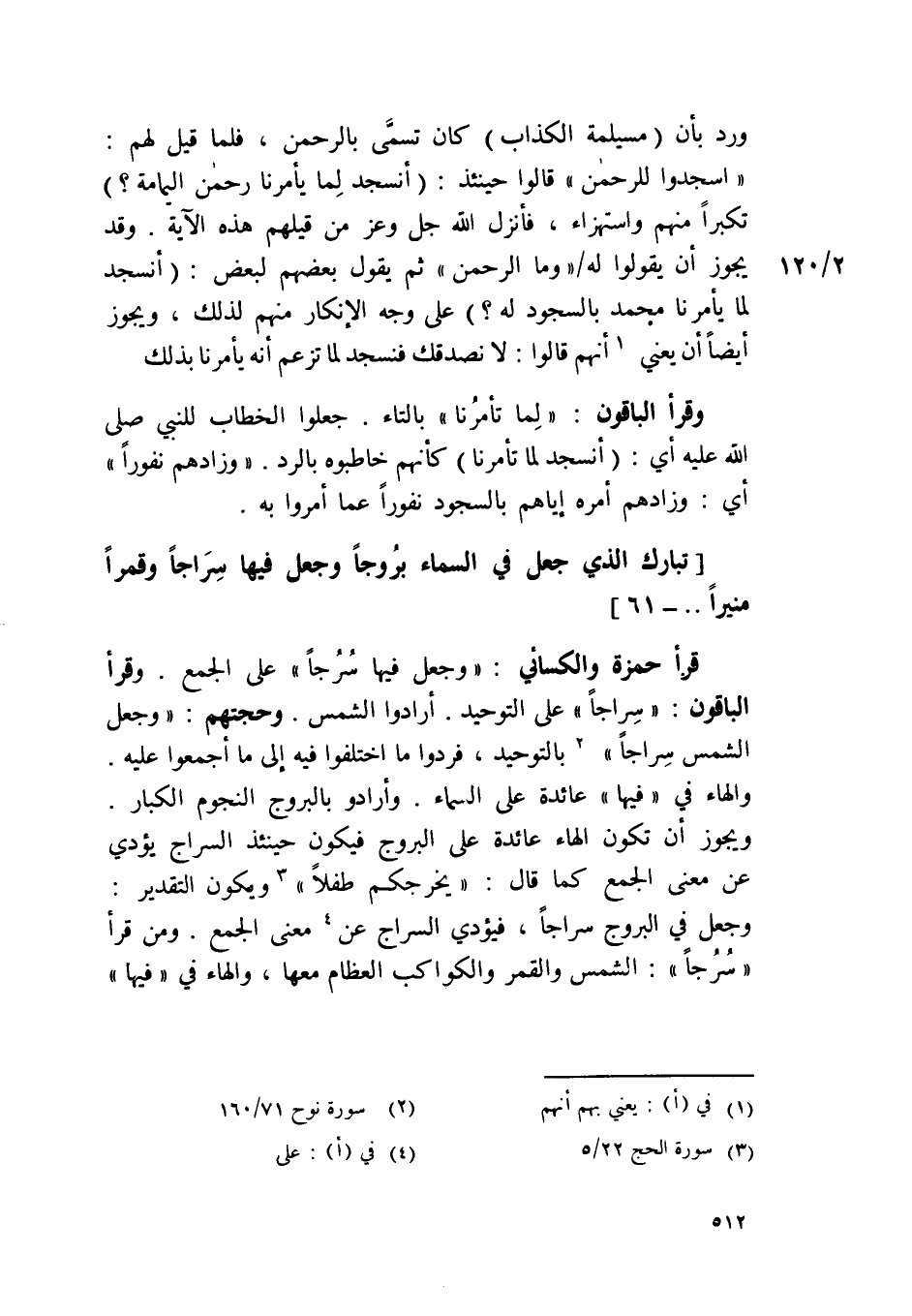 قَرَأَ حَمْزَة وَالْكسَائِيّ / وَجعل فِيهَا سرجا / على الْجمع وَقَرَأَ الْبَاقُونَ {سِرَاجًا} على التَّوْحِيد أَرَادوا الشَّمْس وحجتهم {وَجعل الشَّمْس سِرَاجًا} بِالتَّوْحِيدِ فَردُّوا مَا اخْتلفُوا فِيهِ إِلَى مَا أَجمعُوا عَلَيْهِ وَالْهَاء فِي {فِيهَا} عَائِدَة على السَّمَاء وأرادو بالبروج النُّجُوم الْكِبَار وَيجوز أَن تكون الْهَاء عَائِدَة على البروج فَيكون حِينَئِذٍ السراج يُؤَدِّي عَن معنى الْجمع كَمَا قَالَ {يخرجكم طفْلا} وَيكون التَّقْدِير وَجعل فِي البروج سِرَاجًا فَيُؤَدِّي السراج عَن معنى الْجمع وَمن قَرَأَ سرجا الشَّمْس وَالْقَمَر وَالْكَوَاكِب الْعِظَام مَعهَا وَالْهَاء فِي {فِيهَا}