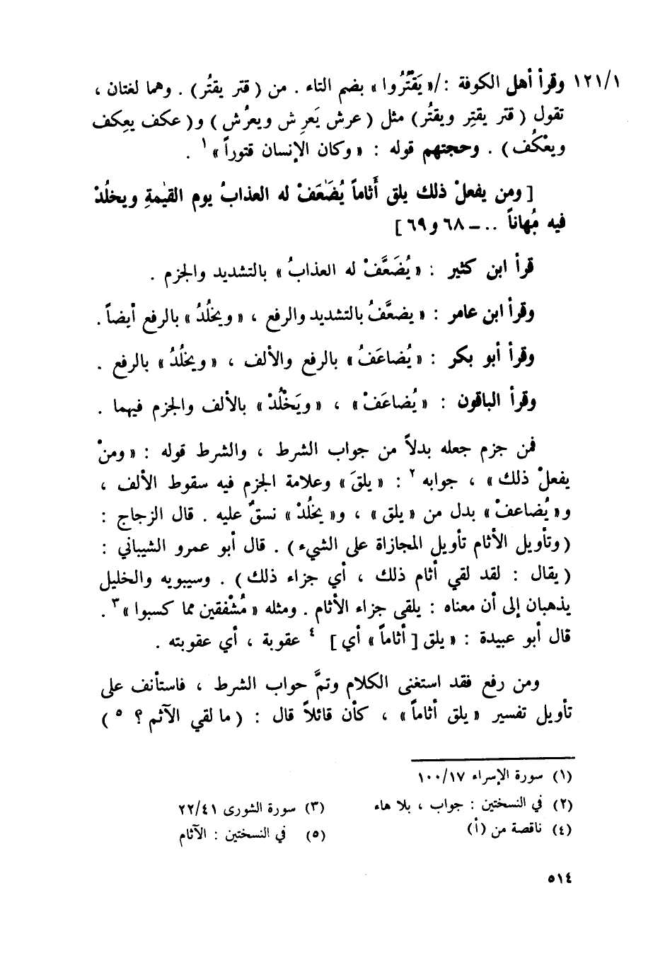 فَمن جزم جعله بَدَلا من جَوَاب الشَّرْط وَالشّرط قَوْله {وَمن يفعل ذَلِك} جَوَابه {يلق} وعلامة الْجَزْم فِيهِ سُقُوط الْألف و {يُضَاعف} بدل من يلق و {ويخلد} نسق عَلَيْهِ قَالَ الزّجاج وَتَأْويل الأثام تَأْوِيل المجازاة على الشَّيْء قَالَ أَبُو عَمْرو الشَّيْبَانِيّ يُقَال لقد لَقِي أثام ذَلِك أَي جَزَاء ذَلِك وسيبويه والخليل يذهبان إِلَى أَن مَعْنَاهُ يلقى جَزَاء الأثام وَمثله {مشفقين مِمَّا كسبوا} قَالَ أَبُو عُبَيْدَة {يلق أثاما} أَي عُقُوبَة أَي عُقُوبَته