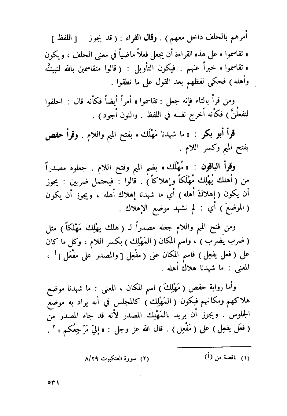 وَأما رِوَايَة حَفْص مهلك اسْم الْمَكَان الْمَعْنى مَا شَهِدنَا مَوضِع هلاكهم ومكانهم فَيكون المهلك كالمجلس فِي أَنه يُرَاد بِهِ مَوضِع الْجُلُوس وَيجوز أَن يُرِيد بالمهلك الْمصدر لِأَنَّهُ قد جَاءَ الْمصدر من فعل يفعل على مفعل قَالَ الله عز وَجل {إِلَيّ مرجعكم}
