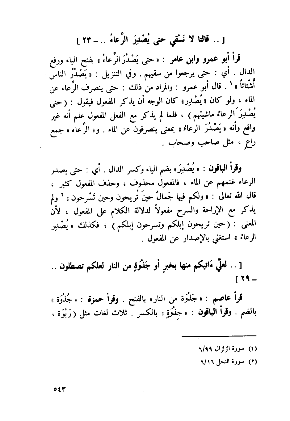 قَرَأَ أبوع عَمْرو وَابْن عَامر {حَتَّى يصدر الرعاء} بِفَتْح الْيَاء وَرفع الدَّال أَي حَتَّى يرجِعوا من سقيهم وَفِي التَّنْزِيل {يصدر النَّاس أشتاتا} قَالَ أَبُو عَمْرو وَالْمرَاد من ذَلِك حَتَّى ينْصَرف الرعاء عَن المَاء وَلَو كَانَ {يصدر} كَانَ الْوَجْه أَن يذكر المعفول فَيَقُول حَتَّى يصدر الرعاء ماشيتهم فَلَمَّا لم يذكر مَعَ الْفِعْل الْمَفْعُول علم أَنه غير وَاقع وَأَنه {يصدر الرعاء} بِمَعْنى يَنْصَرِفُونَ عَن المَاء و {الرعاء} جمع رَاع مثل صَاحب وصحاب