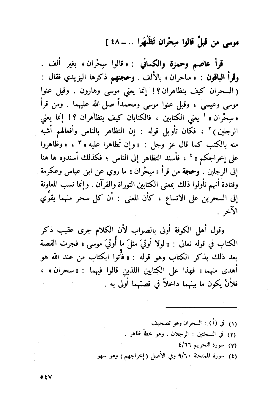 قَرَأَ عَاصِم وَحَمْزَة وَالْكسَائِيّ {قَالُوا سحران} بِغَيْر ألف وَقَرَأَ الْبَاقُونَ / ساحران / بِالْألف وحجتهم ذكرهَا اليزيدي فَقَالَ السحران كَيفَ يتظاهران إِنَّمَا يَعْنِي مُوسَى وَهَارُون وَقيل عنوا مُوسَى وَعِيسَى وَقيل عنوا مُوسَى ومحمدا صلى الله عَلَيْهَا وَسلم وَمن قَرَأَ {سحران} يَعْنِي الْكِتَابَيْنِ فالكتابان كَيفَ يتظاهران إِنَّمَا يَعْنِي الرجلَيْن فَكَانَ تَأْوِيل قَوْله إِن التظاهر بِالنَّاسِ وأفعالهم اشبه مِنْهُ بالكتب كَمَا قَالَ عز وَجل {وَإِن تظاهرا عَلَيْهِ} {وظاهروا على إخراجكم} فأسند التظاهر إِلَى النَّاس فَكَذَلِك أسندوه هَا هُنَا إِلَى الرجلَيْن وَحجَّة من قَرَأَ {سحران} مَا رُوِيَ عَن ابْن عَبَّاس وَعِكْرِمَة وَقَتَادَة أَنهم تأولوا ذَلِك بِمَعْنى الْكِتَابَيْنِ التَّوْرَاة وَالْقُرْآن وَإِنَّمَا نسب المعاونة إِلَى السحرين على الاتساع كَأَن الْمَعْنى أَن كل سحر مِنْهُمَا يُقَوي الآخر