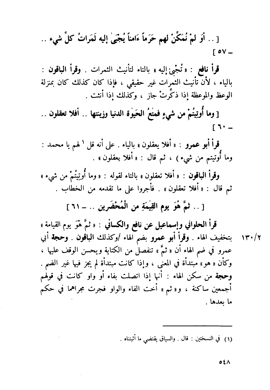 قَرَأَ نَافِع / تجبى إِلَيْهِ / بِالتَّاءِ لتأنيث الثمرات وَقَرَأَ الْبَاقُونَ بِالْيَاءِ لِأَن تَأْنِيث الثمرات غير حَقِيقِيّ فَإِذا كَانَ كَذَلِك كَانَ بِمَنْزِلَة الْوَعْظ وَالْمَوْعِظَة إِذا ذكرت جَازَ وَكَذَلِكَ إِذا أنثت
