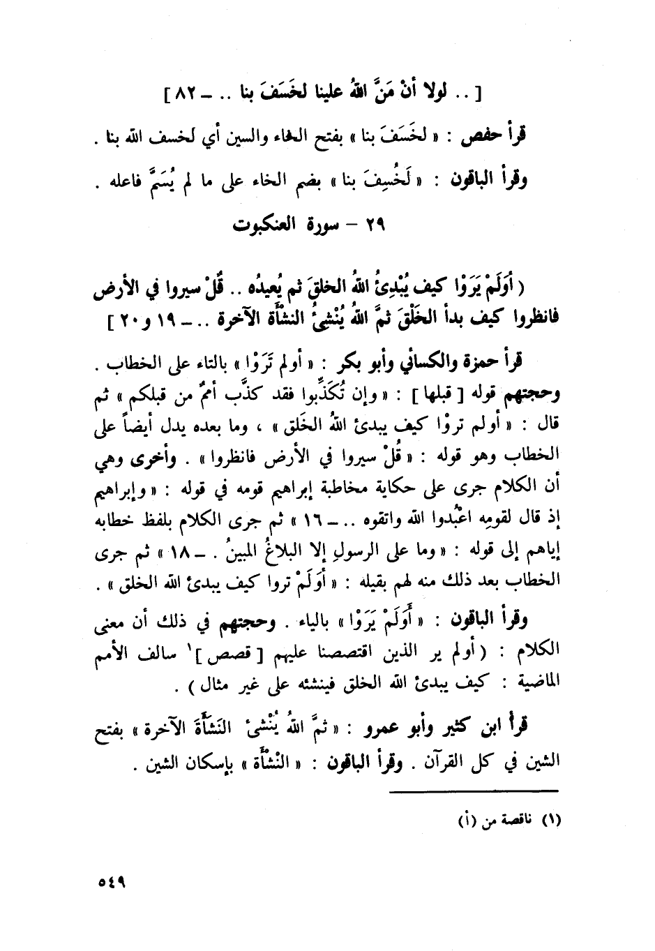 قَرَأَ حَمْزَة وَالْكسَائِيّ وَأَبُو بكر / أولم تروا / بِالتَّاءِ على الْخطاب وحجتهم قَوْله قبلهَا {وَإِن تكذبوا فقد كذب أُمَم من قبلكُمْ} ثمَّ قَالَ / أَو لم تروا كَيفَ يبدئ الله الْخلق / وَمَا بعده يدل أَيْضا على الْخطاب وَهُوَ قَوْله {قل سِيرُوا فِي الأَرْض فانظروا} وَأُخْرَى وَهِي أَن الْكَلَام جرى على حِكَايَة مُخَاطبَة إِبْرَاهِيم قومه فِي قَوْله {وَإِبْرَاهِيم إِذْ قَالَ لِقَوْمِهِ اعبدوا الله واتقوه} ثمَّ جرى الْكَلَام بِلَفْظ خطابه إيَّاهُم إِلَى قَوْله {وَمَا على الرَّسُول إِلَّا الْبَلَاغ الْمُبين} ثمَّ جرى الْخطاب بعد ذَلِك مِنْهُ لَهُم بقيله / أولم تروا كَيفَ يبدئ الله الْخلق /