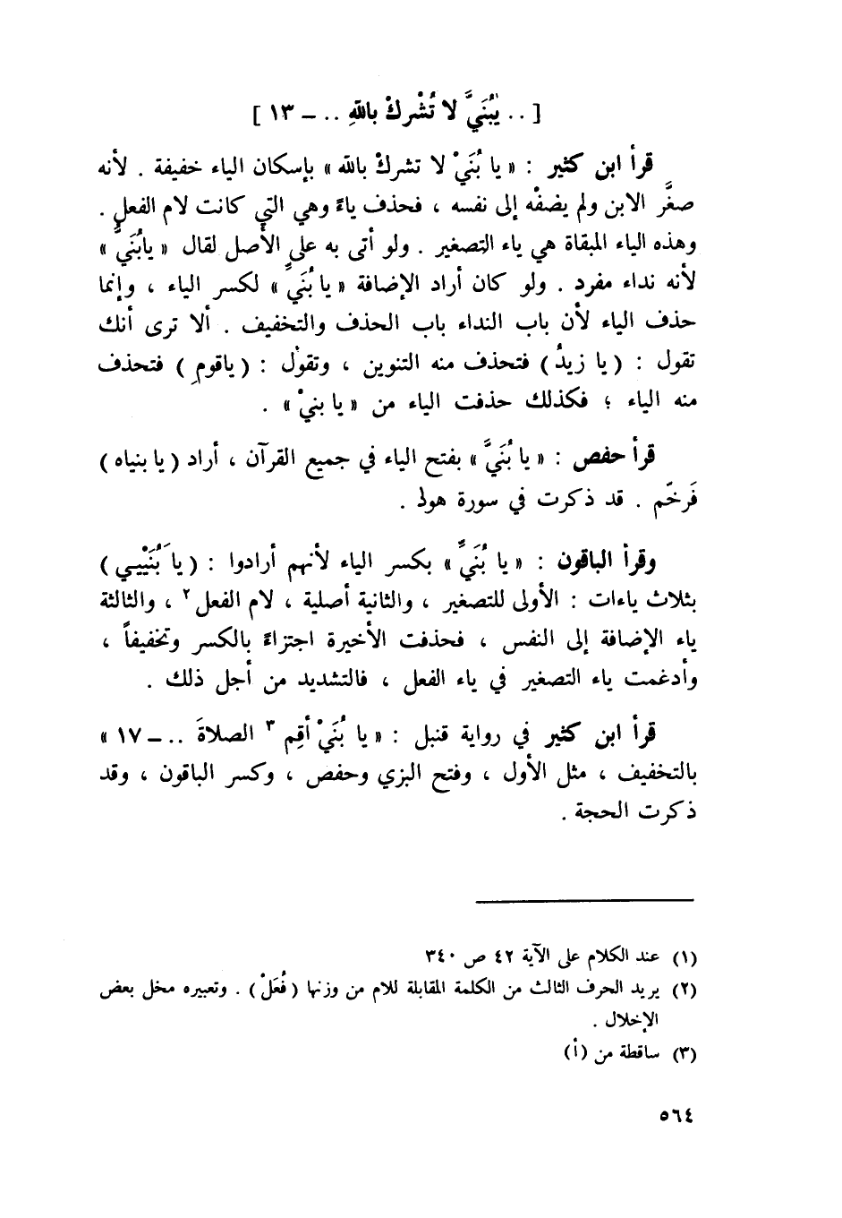 قَرَأَ ابْن كثير {يَا بني لَا تشرك بِاللَّه} بِإِسْكَان الْيَاء خَفِيفَة لِأَنَّهُ صغر الابْن وَلم يضفه إِلَى نَفسه فَحذف يَاء وَهِي الَّتِي كَانَت لَام الْفِعْل وَهَذِه الْيَاء المبقاة هِيَ يَاء التصغير وَلَو أَتَى بِهِ على الأَصْل لقَالَ يَا بني لِأَنَّهُ نِدَاء مُفْرد وَلَو كَانَ أرادالإضافة يَا بني لكسر الْيَاء وَإِنَّمَا حذف الْيَاء لِأَن بَاب النداء بَاب الْحَذف وَالتَّخْفِيف أَلا ترى أَنَّك تَقول يَا زيد فتحذف مِنْهُ التَّنْوِين وَتقول يَا قوم فتحذف مِنْهُ الْيَاء فَكَذَلِك حذفت الْيَاء من {يَا بني}