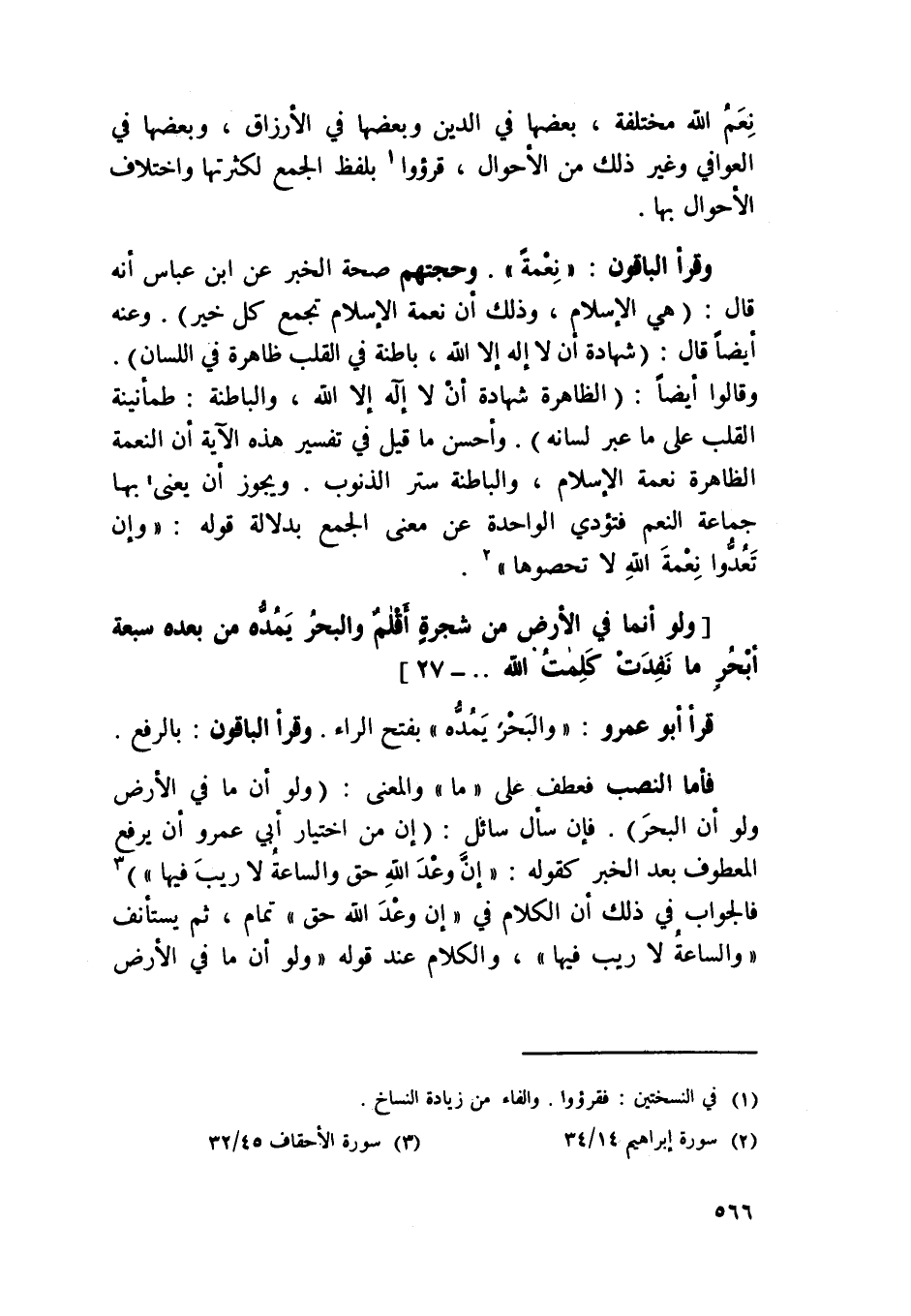فَأَما النصب فعطف على {مَا} وَالْمعْنَى وَلَو أَن مَا فِي الأَرْض وَلَو أَن الْبَحْر فَإِن سَأَلَ سَائل إِن من اخْتِيَار أبي عَمْرو أَن يرفع الْمَعْطُوف بعد الْخَبَر كَقَوْلِه {إِن وعد الله حق والساعة لَا ريب فِيهَا} فَالْجَوَاب فِي ذَلِك أَن الْكَلَام فِي {إِن وعد الله حق} تَمام ثمَّ يسْتَأْنف {والساعة لَا ريب فِيهَا} وَالْكَلَام عِنْد قَوْله {وَلَو أَنما فِي الأَرْض من شَجَرَة أَقْلَام}
