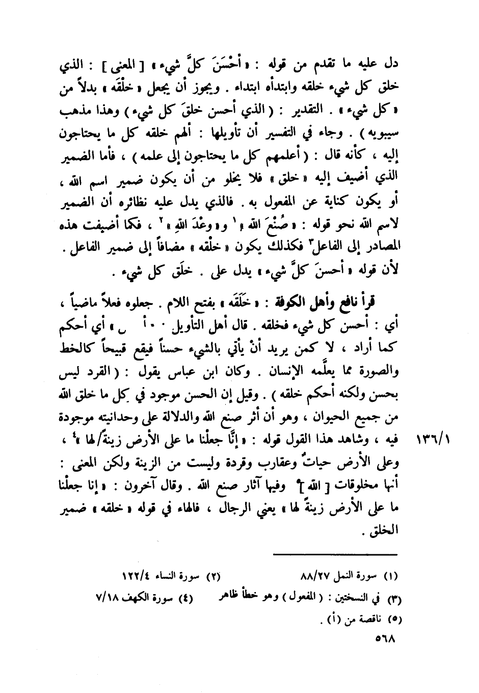 قَرَأَ نَافِع وَأهل الْكُوفَة {خلقه} بِفَتْح اللَّام جَعَلُوهُ فعلا مَاضِيا أَي أحسن كل شَيْء فخلقه قَالَ أهل التَّأْوِيل {أحسن} أَي أحكم كَمَا أَرَادَ لَا كمن يُرِيد أَن يَأْتِي بالشَّيْء حسنا فَيَقَع قبيحا كالخط وَالصُّورَة مِمَّا يُعلمهُ الْإِنْسَان وَكَانَ ابْن عَبَّاس يَقُول القرد لَيْسَ بِحسن وَلكنه أحكم خلقه وَقيل إِن الْحسن مَوْجُود فِي كل مَا خلق الله من جَمِيع الْحَيَوَان وَهُوَ أَن أثر صنع الله وَالدّلَالَة على وحدانيته مَوْجُودَة فِيهِ وَشَاهد هَذَا القَوْل قَوْله {إِنَّا جعلنَا مَا على الأَرْض زِينَة لَهَا} وعَلى الأَرْض حيات وعقارب وقردة وَلَيْسَت من الزِّينَة وَلَكِن الْمَعْنى انها مخلوقات الله وفيهَا آثَار صنع الله وَقَالَ آخَرُونَ {إِنَّا جعلنَا مَا على الأَرْض زِينَة لَهَا} يَعْنِي الرِّجَال فالهاء فِي قَوْله {خلقه} ضمير الْخلق
