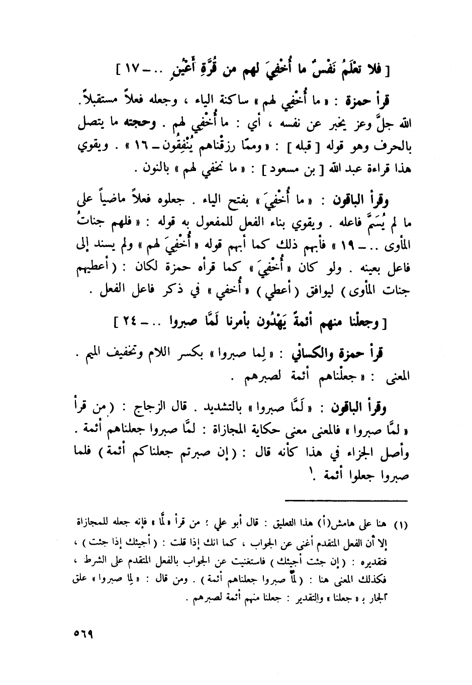 قَرَأَ حَمْزَة وَالْكسَائِيّ لما صَبَرُوا بِكَسْر اللَّام وَتَخْفِيف الْمِيم الْمَعْنى / جعلناهم أَئِمَّة لصبرهم /