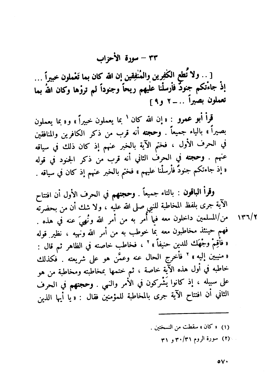 قَرَأَ أَبُو عَمْرو / إِن الله كَانَ بِمَا يعْملُونَ خَبِيرا / و / بِمَا يعْملُونَ بَصيرًا / بِالْيَاءِ جَمِيعًا وحجته أَنه قرب من ذكر الْكَافرين وَالْمُنَافِقِينَ فِي الْحَرْف الأول فختم الْآيَة بالْخبر عَنْهُم إِذْ كَانَ ذَلِك فِي سِيَاقه عَنْهُم وحجته فِي الْحَرْف الثَّانِي أَنه قرب من ذكر الْجنُود فِي قَوْله {إِذْ جاءتكم جنود فَأَرْسَلنَا عَلَيْهِم} فختم بالْخبر عَنْهُم إِذْ كَانَ فِي سِيَاقه