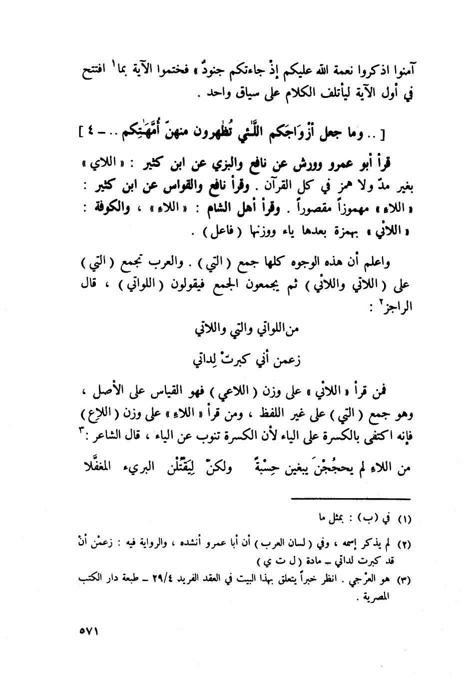 فَمن قَرَأَ {اللائي} على وزن اللاعي فَهُوَ الْقيَاس على الأَصْل وَهُوَ جمع الَّتِي على غير اللَّفْظ وَمن قَرَأَ / اللاء / على وزن اللاع فَإِنَّهُ اكْتفى بالكسرة على الْيَاء لِأَن الكسرة تنوب عَن الْيَاء قَالَ الشَّاعِر