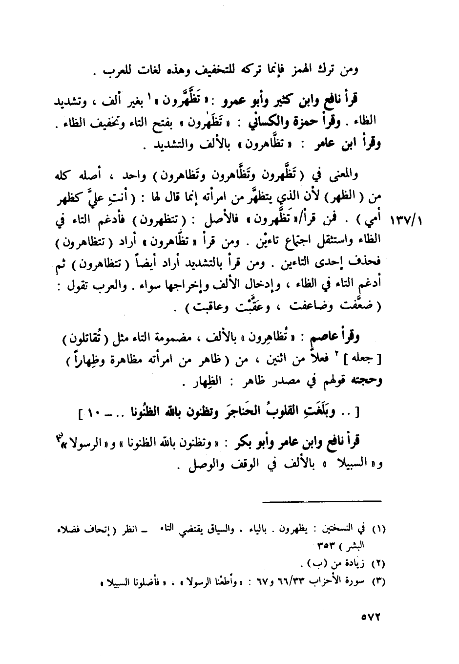 قَرَأَ نَافِع وَابْن كثير وَأَبُو عَمْرو {تظْهرُونَ} بِغَيْر ألف وَتَشْديد الظَّاء وَقَرَأَ حَمْزَة الْكسَائي {تظْهرُونَ} بِفَتْح التَّاء وَتَخْفِيف الظَّاء وَقَرَأَ ابْن عَامر تظاهرون بِالْألف وَالتَّشْدِيد