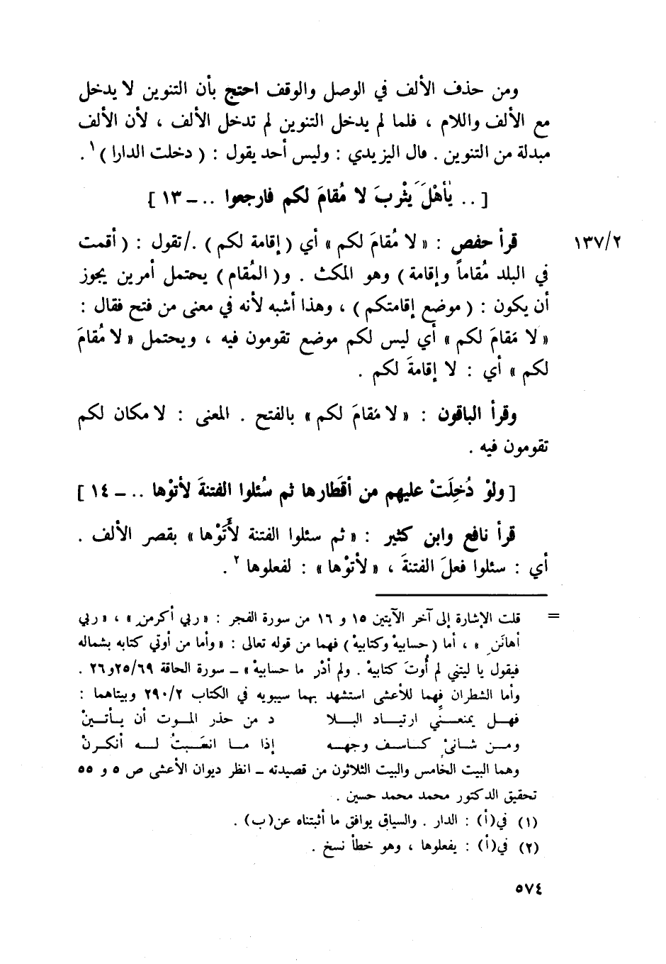 قَرَأَ حَفْص لَا مقَام لكم أَي إِقَامَة لكم تَقول أَقمت فِي الْبَلَد مقَاما وَإِقَامَة وَهُوَ الْمكْث وَالْمقَام يحْتَمل أَمريْن يجوز أَن يكون مَوضِع إقامتكم وَهَذَا أشبه لِأَنَّهُ فِي معنى من فتح فَقَالَ لَا مقَام لكم أَي لَيْسَ لكم مَوضِع تقومون فِيهِ وَيحْتَمل {لَا مقَام لكم} أَي لَا إِقَامَة لكم