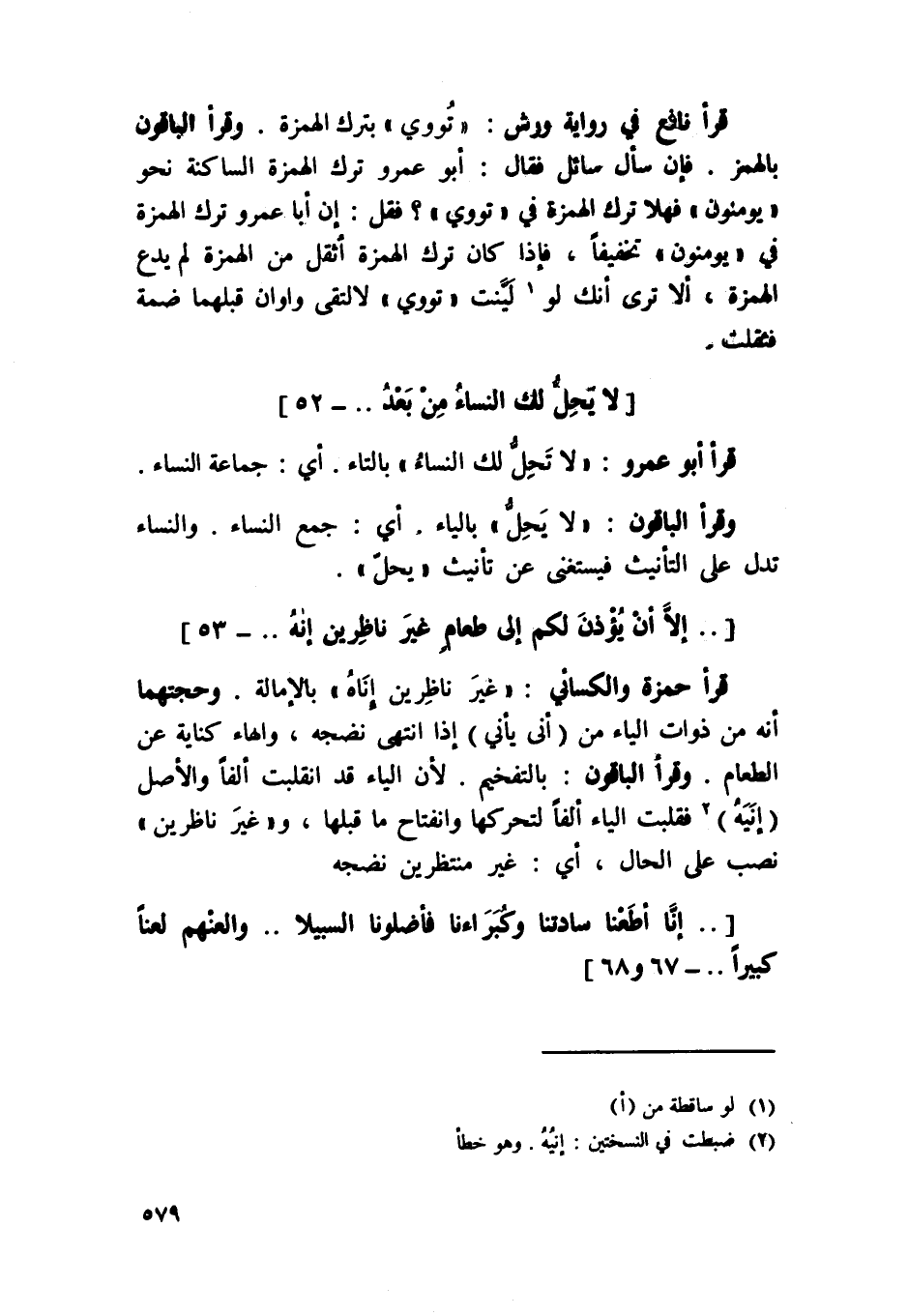 قَرَأَ حَمْزَة وَالْكسَائِيّ {غير ناظرين إناه} بالإمالة وحجتهما أَنه من ذَوَات الْيَاء من أَنى يأني إِذا انْتهى نضجه وَالْهَاء كِنَايَة عَن الطَّعَام وَقَرَأَ الْبَاقُونَ بالتفخيم لِأَن الْيَاء قد انقلبت ألفا وَالْأَصْل إنيه فقلبت الْيَاء ألفا لتحركها وانفتاح مَا قبلهَا و {غير ناظرين} نصب على الْحَال أَي غير منتظرين نضجه