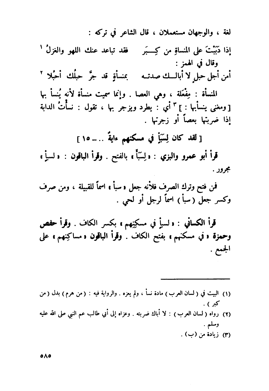 قَرَأَ الْكسَائي {لسبإ فِي مسكنهم} بِكَسْر الْكَاف وَقَرَأَ حَفْص وَحَمْزَة {فِي مسكنهم} بِفَتْح الْكَاف وَقَرَأَ الْبَاقُونَ {مساكنهم} على الْجمع