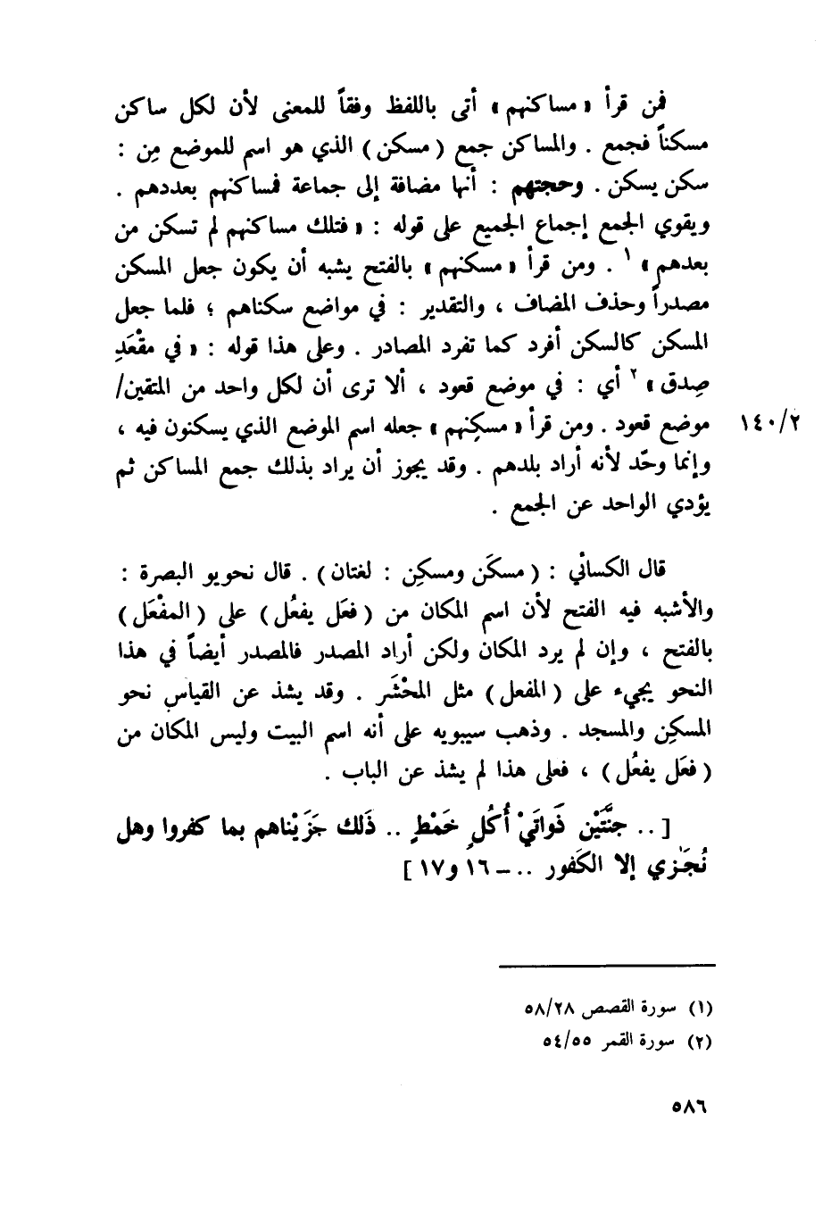 فَمن قَرَأَ مساكنهم أَتَى بِاللَّفْظِ وفقا للمعنى لِأَن لكل سَاكن مسكنا فَجمع والمساكن جمع مسكن الَّذِي هُوَ اسْم للموضع من سكن يسكن وحجتهم أَنَّهَا مُضَافَة إِلَى جمَاعَة فمساكنهم بعددهم وَيُقَوِّي الْجمع إِجْمَاع الْجَمِيع على قَوْله {فَتلك مساكنهم لم تسكن من بعدهمْ} وَمن قَرَأَ {مسكنهم} بِالْفَتْح يشبه أَن يكون جعل الْمسكن مصدرا وَحذف الْمُضَاف وَالتَّقْدِير فِي مَوَاضِع سكناهم فَلَمَّا جعل الْمسكن كالسكن أفرد كَمَا تفرد المصادر وعَلى هَذَا قَوْله {فِي مقْعد صدق} أَي فِي مَوضِع قعُود أَلا ترى أَن لكل وَاحِد من الْمُتَّقِينَ مَوضِع قعُود وَمن قَرَأَ مسكنهم جعله اسْم الْموضع الَّذِي يسكنون فِيهِ وَإِنَّمَا وحد لِأَنَّهُ أَرَادَ بلدهم وَقد يجوز أَن يُرَاد بذلك جمع المساكن ثمَّ يُؤَدِّي الْوَاحِد عَن الْجمع