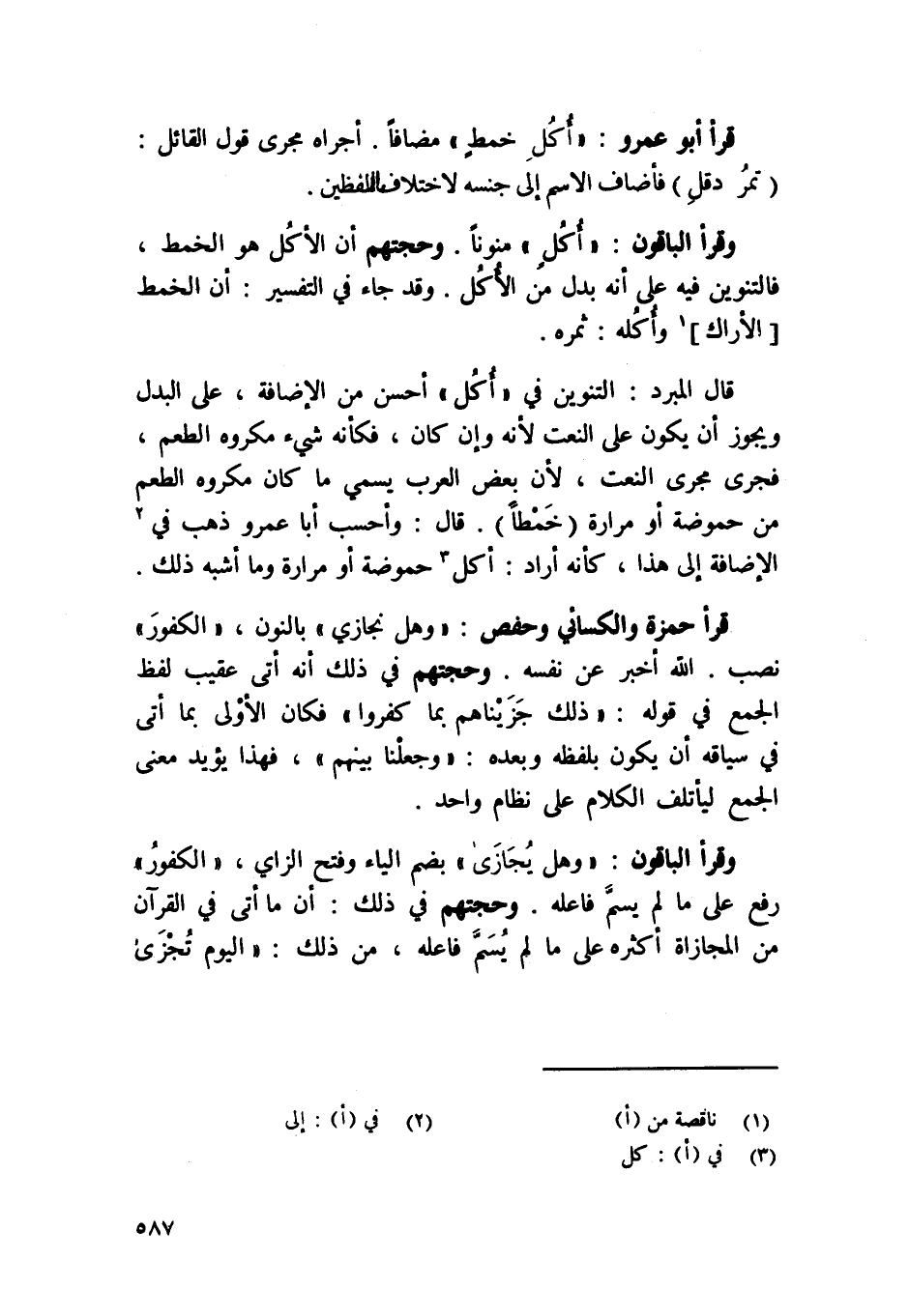 قَالَ الْمبرد التَّنْوِين فِي {أكل} أحسن من الْإِضَافَة على الْبَدَل وَيجوز أَن يكون على النَّعْت لِأَنَّهُ وَإِن كَانَ فَكَأَنَّهُ شَيْء مَكْرُوه الطّعْم فَجرى مجْرى النَّعْت لِأَن بعض الْعَرَب يُسَمِّي مَا كَانَ مَكْرُوه الطّعْم من حموضة أَو مرَارَة خمطا قَالَ وأحسب أَبَا عَمْرو ذهب فِي الْإِضَافَة إِلَى هَذَا كَأَنَّهُ أَرَادَ أكل حموضة أَو مرَارَة وَمَا أشبه ذَلِك
