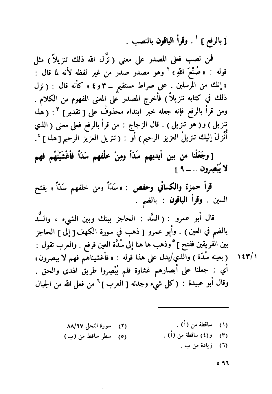 قَالَ أَبُو عَمْرو السد الحاجز بَيْنك وَبَين الشَّيْء والسد بِالضَّمِّ فِي الْعين وَأَبُو عَمْرو ذهب فِي سُورَة الْكَهْف إِلَى الحاجز بَين الْفَرِيقَيْنِ فَفتح وَذهب هَا هُنَا إِلَى سدة الْعين فَرفع وَالْعرب تَقول بِعَيْنِه سدة وَالَّذِي يدل على هَذَا قَوْله {فأغشيناهم فهم لَا يبصرون} أَي جعلنَا على أَبْصَارهم غشاوة فَلم يبصروا طَرِيق الْهدى وَالْحق وَقَالَ أَبُو عُبَيْدَة كل شَيْء وجدته الْعَرَب من فعل الله من الْجبَال