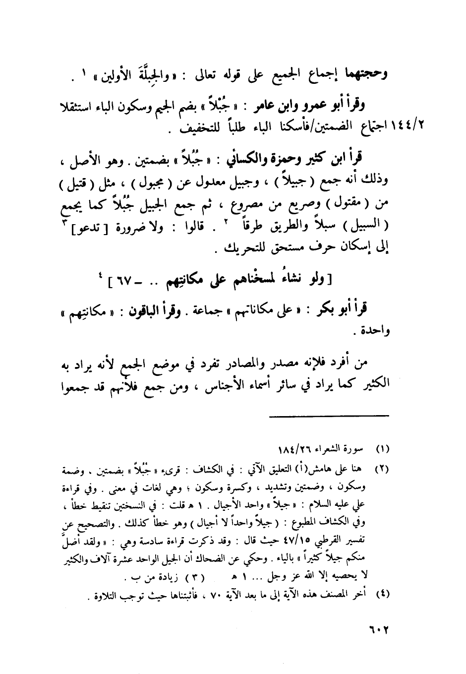 قَرَأَ ابْن كثير وَحَمْزَة وَالْكسَائِيّ جبلا بِضَمَّتَيْنِ وَهُوَ الأَصْل وَذَلِكَ أَنه جمع جبيلا وجبيل معدول عَن مجبول مثل قَتِيل من مقتول وصريع من مصروع ثمَّ جمع الجبيل جبلا كَمَا يجمع السَّبِيل سبلا وَالطَّرِيق طرقا قَالُوا وَلَا ضَرُورَة تَدْعُو إِلَى إسكان حرف مُسْتَحقّ للتحريك