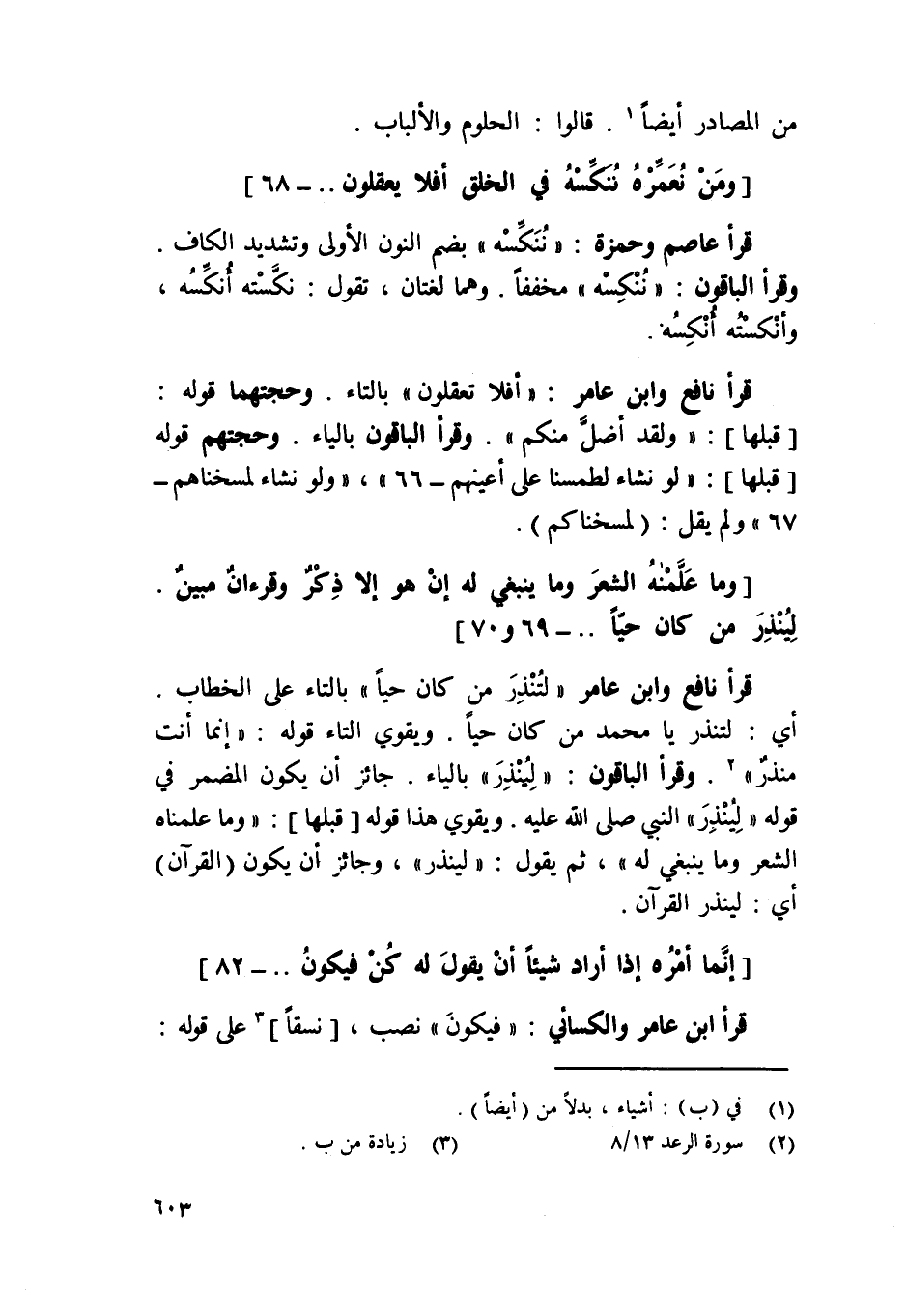 قَرَأَ عَاصِم وَحَمْزَة {ننكسه} بِضَم النُّون الأولى وَتَشْديد الْكَاف وَقَرَأَ الْبَاقُونَ ننكسه مخففا وهما لُغَتَانِ تَقول نكسته أنكسه وأنكسته أنكسه