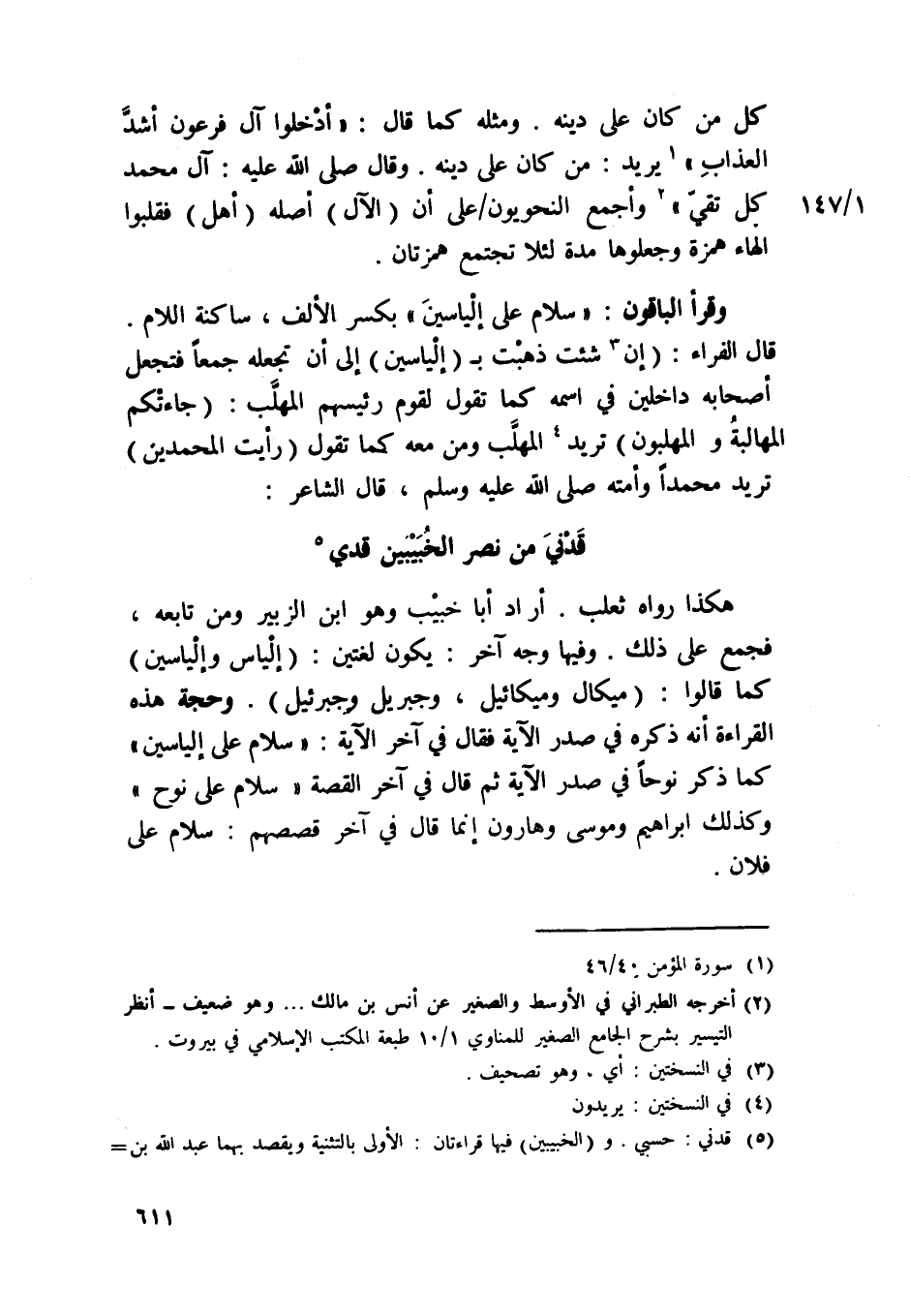 وَقَرَأَ الْبَاقُونَ / سَلام على إلياسين / بِكَسْر الْألف سَاكِنة اللَّام قَالَ الْفراء إِن شِئْت ذهبت ب إلياسين إِلَى أَن تَجْعَلهُ جمعا فتجعل أَصْحَابه داخلين فِي اسْمه كَمَا تَقول لقوم رئيسهم الْمُهلب جاءتكم المهالبة والمهلبون تُرِيدُ الْمُهلب وَمن مَعَه كَمَا تَقول رَأَيْت المحمدين تُرِيدُ مُحَمَّدًا وَأمته صلى الله عَلَيْهِ وَسلم قَالَ الشَّاعِر ... قدني من نصر الخبيبين قدي ...