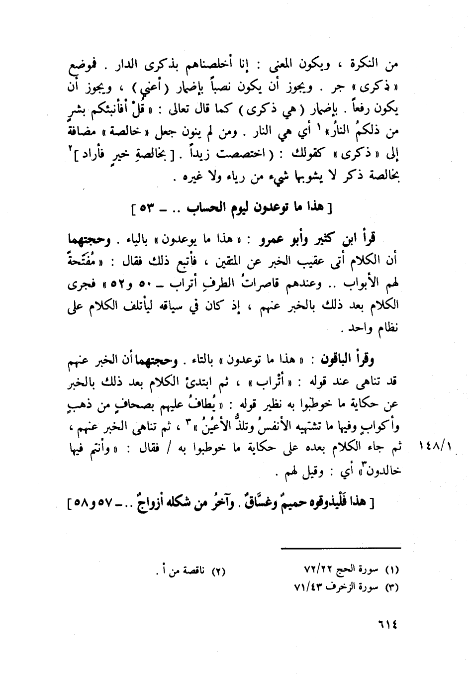 قَرَأَ ابْن كثير وَأَبُو عَمْرو / هَذَا مَا يوعدون / بِالْيَاءِ وحجتهما أَن الْكَلَام أَتَى عقيب الْخَبَر عَن الْمُتَّقِينَ فأتبع ذَلِك فَقَالَ {مفتحة لَهُم الْأَبْوَاب} {وَعِنْدهم قاصرات الطّرف أتراب} 50 و 52 فَجرى الْكَلَام بعد ذَلِك بالْخبر عَنْهُم إِذْ كَانَ فِي سِيَاقه ليأتلف الْكَلَام على نظام وَاحِد