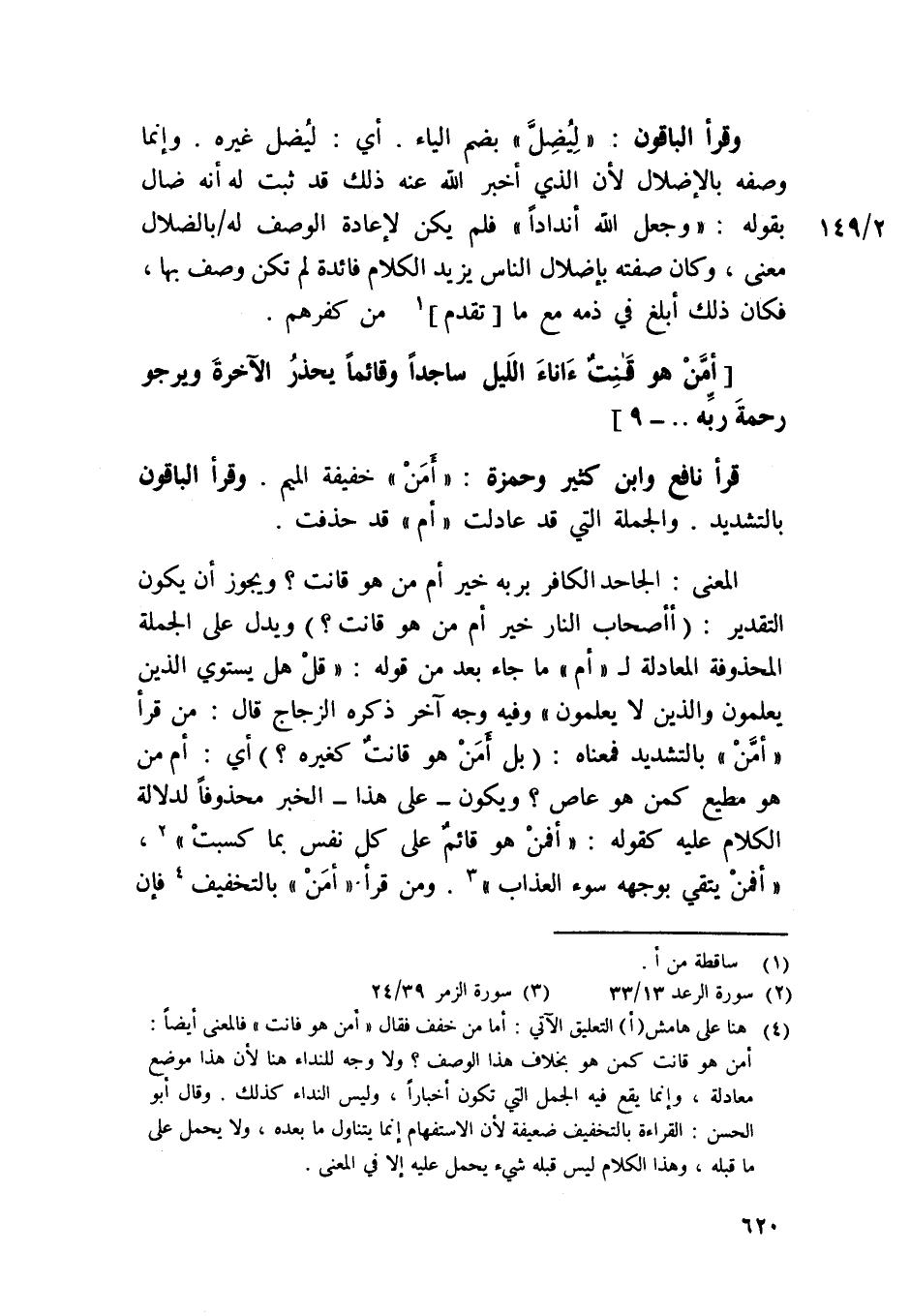 الْمَعْنى الجاحد الْكَافِر بربه خير أم من هُوَ قَانِت وَيجوز أَن يكون التَّقْدِير أأصحاب النَّار خير أم من هُوَ قَانِت وَيدل على الْجُمْلَة المحذوفة المعادلة ل {أم} مَا جَاءَ بعد من قَوْله {قل هَل يَسْتَوِي الَّذين يعلمُونَ وَالَّذين لَا يعلمُونَ} وَفِيه وَجه آخر ذكره الزّجاج قَالَ من قَرَأَ {آمن} بِالتَّشْدِيدِ فَمَعْنَاه بل أَمن هُوَ قَانِت كَغَيْرِهِ أَي أم من هُوَ مُطِيع كمن هُوَ عَاص وَيكون على هَذَا الْخَبَر محذوفا لدلَالَة الْكَلَام عَلَيْهِ كَقَوْلِه {أَفَمَن هُوَ قَائِم على كل نفس بِمَا كسبت} {أَفَمَن يَتَّقِي بِوَجْهِهِ سوء الْعَذَاب} وَمن قَرَأَ {آمن} بِالتَّخْفِيفِ فَإِن