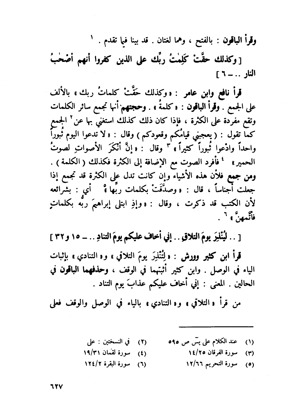 قَرَأَ نَافِع وَابْن عَامر / وَكَذَلِكَ حقت كَلِمَات رَبك / بِالْألف على الْجمع وَقَرَأَ الْبَاقُونَ {كلمة} وحجتهم أَنَّهَا تجمع سَائِر الْكَلِمَات وَتَقَع مُفْردَة على الْكَثْرَة فَإِذا كَانَ ذَلِك كَذَلِك استغني بهَا عَن الْجمع كَمَا تَقول يُعجبنِي قيامكم وقعودكم وَقَالَ {لَا تدعوا الْيَوْم ثبورا وَاحِدًا وَادعوا ثبورا كثيرا} وَقَالَ {إِن أنكر الْأَصْوَات لصوت الْحمير} فأفرد الصَّوْت مَعَ الْإِضَافَة إِلَى الْكَثْرَة فَكَذَلِك الْكَلِمَة وَمن جمع فَلِأَن هَذِه الْأَشْيَاء وَإِن كَانَت تدل على الْكَثْرَة قد تجمع إِذا جعلت أجناسا قَالَ {وصدقت بِكَلِمَات رَبهَا} أَي بشرائعه لِأَن الْكتب قد ذكرت وَقَالَ {وَإِذ ابتلى إِبْرَاهِيم ربه بِكَلِمَات فأتمهن}