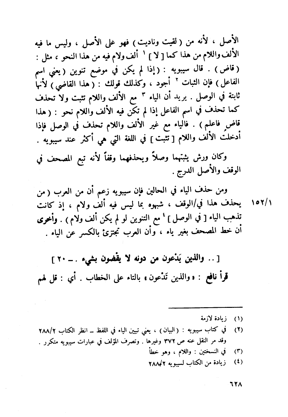 الأَصْل لِأَنَّهُ من لقِيت وناديت فَهُوَ على الأَصْل وَلَيْسَ مَا فِيهِ الْألف وَاللَّام من هَذَا كَمَا لَا ألف وَلَام فِيهِ من هَذَا النَّحْو مثل قَاض قَالَ سِيبَوَيْهٍ إِذا لم يكن فِي مَوضِع تَنْوِين يَعْنِي اسْم الْفَاعِل فَإِن الثَّبَات أَجود وَكَذَلِكَ قَوْلك هَذَا القَاضِي لِأَنَّهَا ثَابِتَة فِي الْوَصْل يُرِيد أَن الْيَاء مَعَ الْألف وَاللَّام تثبت وَلَا تحذف كَمَا تحذف فِي اسْم الْفَاعِل إِذا لم تكن فِيهِ الْألف وَاللَّام نَحْو هَذَا قَاض فَاعْلَم فالياء مَعَ غير الْألف وَاللَّام تحذف فِي الْوَصْل فَإِذا أدخلت الْألف وَاللَّام تثبت فِي اللُّغَة الَّتِي هِيَ أَكثر عِنْد سِيبَوَيْهٍ