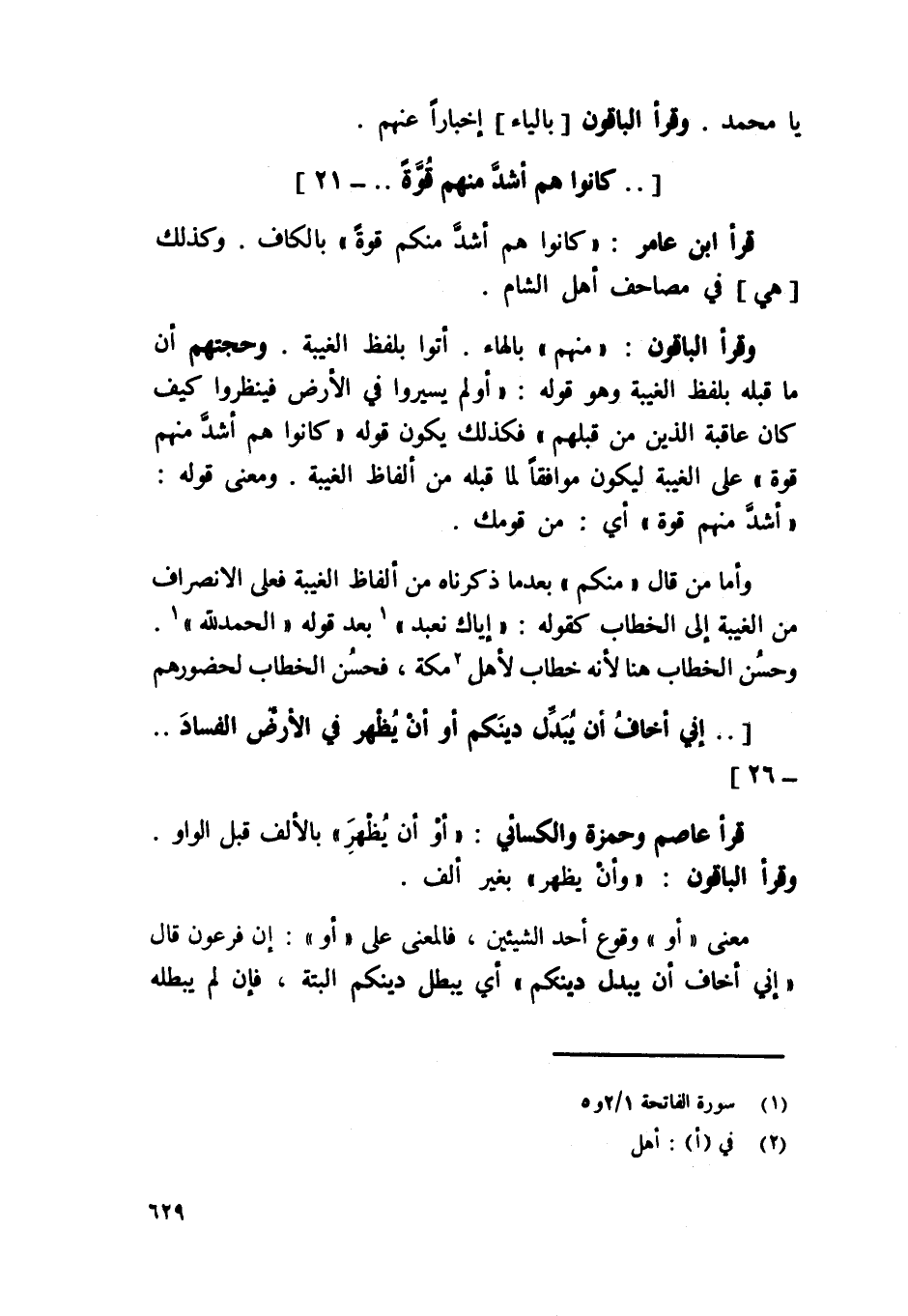 قَرَأَ ابْن عَامر / كَانُوا هم أَشد مِنْكُم قُوَّة / بِالْكَاف وَكَذَلِكَ هِيَ فِي مصاحف أهل الشَّام