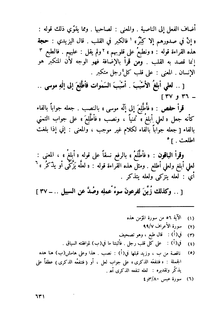 قَرَأَ حَفْص {فَأطلع إِلَى إِلَه مُوسَى} بِالنّصب جعله جَوَابا بِالْفَاءِ كَأَنَّهُ جعل {لعَلي أبلغ} تمنيا وَنصب {فَاطلع} على جَوَاب التَّمَنِّي بِالْفَاءِ جعله جَوَابا بِالْفَاءِ لكَلَام غير مُوجب وَالْمعْنَى إِنِّي إِذا بلغت اطَّلَعت
