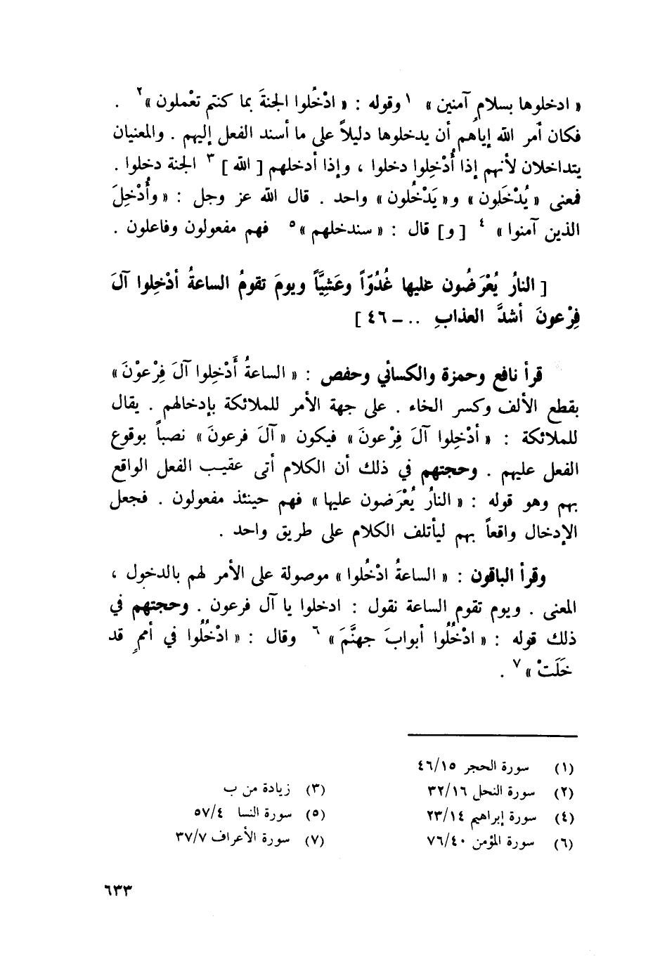 قَرَأَ نَافِع وَحَمْزَة وَالْكسَائِيّ وَحَفْص {السَّاعَة أدخلُوا آل فِرْعَوْن} بِقطع الْألف وَكسر الْخَاء على جِهَة الْأَمر للْمَلَائكَة بإدخالهم يُقَال للْمَلَائكَة {أدخلُوا آل فِرْعَوْن} فَيكون {آل فِرْعَوْن} نصبا بِوُقُوع الْفِعْل عَلَيْهِم وحجتهم فِي ذَلِك أَن الْكَلَام أَتَى عقيب الْفِعْل الْوَاقِع بهم وَهُوَ قَوْله {النَّار يعرضون عَلَيْهَا} فهم حِينَئِذٍ مفعولون فَجعل الإدخال وَاقعا بهم ليأتلف الْكَلَام على طرق وَاحِد