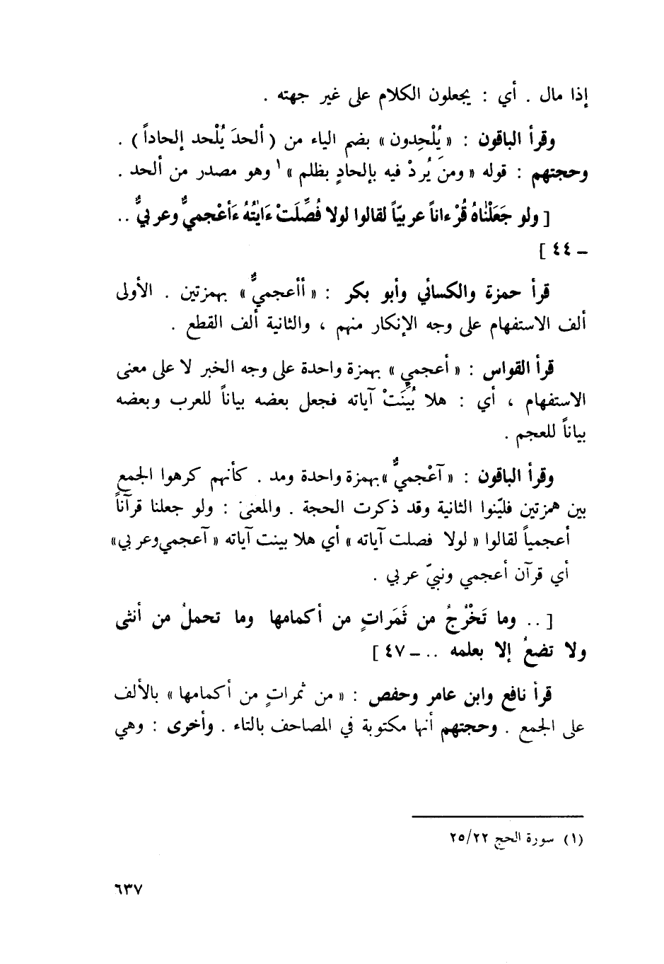 وَقَرَأَ الْبَاقُونَ آعجمي بِهَمْزَة وَاحِدَة وَمد كَأَنَّهُمْ كَرهُوا الْجمع بَين همزتين فلينوا الثَّانِيَة وَقد ذكرت الْحجَّة وَالْمعْنَى وَلَو جعلنَا قُرْآنًا أعجميا لقالوا {لَوْلَا فصلت آيَاته} أَي هلا بيّنت آيَاته / آعجمي وعربي / أَي قُرْآن أعجمي وَنَبِي عَرَبِيّ