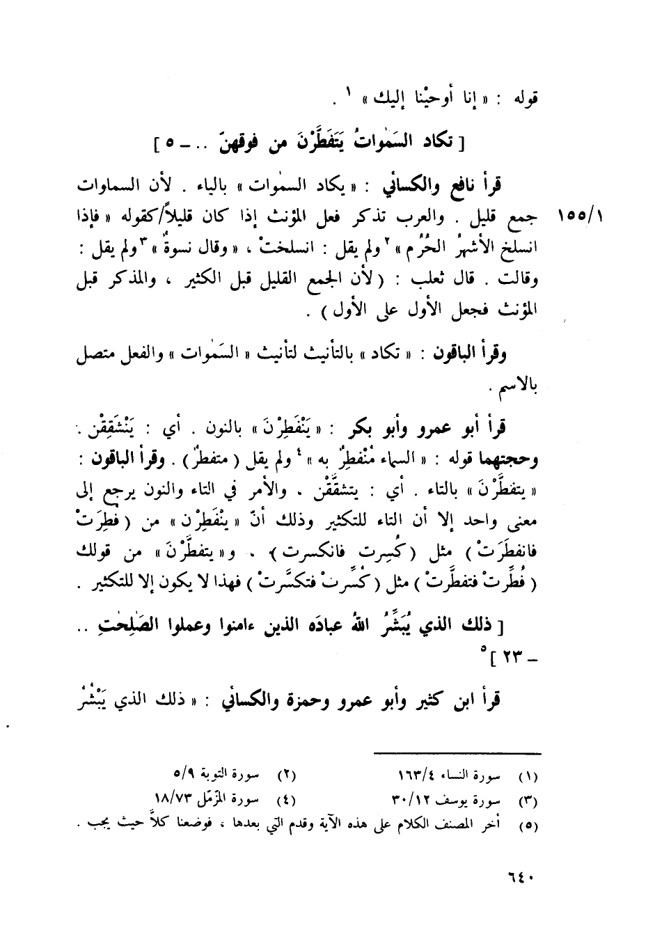 قَرَأَ نَافِع وَالْكسَائِيّ / يكَاد السَّمَوَات / بِالْيَاءِ لِأَن السَّمَاوَات جمع قَلِيل وَالْعرب تذكر فعل الْمُؤَنَّث إِذا كَانَ قَلِيلا كَقَوْلِه {فَإِذا انْسَلَخَ الْأَشْهر الْحرم} وَلم يقل انسلخت {وَقَالَ نسْوَة} وَلم يقل وَقَالَت قَالَ ثَعْلَب لِأَن الْجمع الْقَلِيل قبل الْكثير والمذكر قبل الْمُؤَنَّث فَجعل الأول على الأول