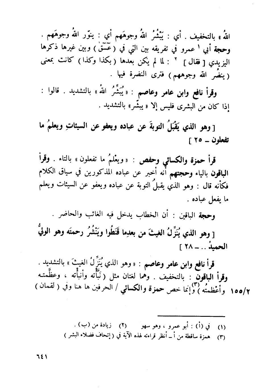 قَرَأَ حَمْزَة وَالْكسَائِيّ وَحَفْص {وَيعلم مَا تَفْعَلُونَ} بِالتَّاءِ وَقَرَأَ الْبَاقُونَ بِالْيَاءِ وحجتهم أَنه أخبر عَن عباده الْمَذْكُورين فِي سِيَاق الْكَلَام فَكَأَنَّهُ قَالَ وَهُوَ الَّذِي يقبل التَّوْبَة عَن عباده وَيَعْفُو عَن السَّيِّئَات وَيعلم مَا يفعل عباده