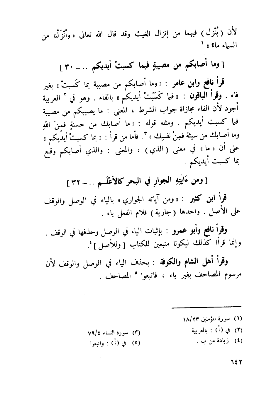 قَرَأَ نَافِع وَابْن عَامر / وَمَا أَصَابَكُم من مُصِيبَة بِمَا كسبت / بِغَيْر فَاء وَقَرَأَ الْبَاقُونَ {فبمَا كسبت أَيْدِيكُم} بِالْفَاءِ وَهُوَ فِي الْعَرَبيَّة أَجود لِأَن الْفَاء مجازاة جَوَاب الشَّرْط الْمَعْنى مَا يُصِيبكُم من مُصِيبَة فبمَا كسبت أَيْدِيكُم وَمثله قَوْله {مَا أَصَابَك من حَسَنَة فَمن الله وَمَا أَصَابَك من سَيِّئَة فَمن نَفسك} فَأَما من قَرَأَ / بِمَا كسبت أَيْدِيكُم / على أَن مَا فِي معنى الَّذِي وَالْمعْنَى وَالَّذِي أَصَابَكُم وَقع بِمَا كسبت أَيْدِيكُم