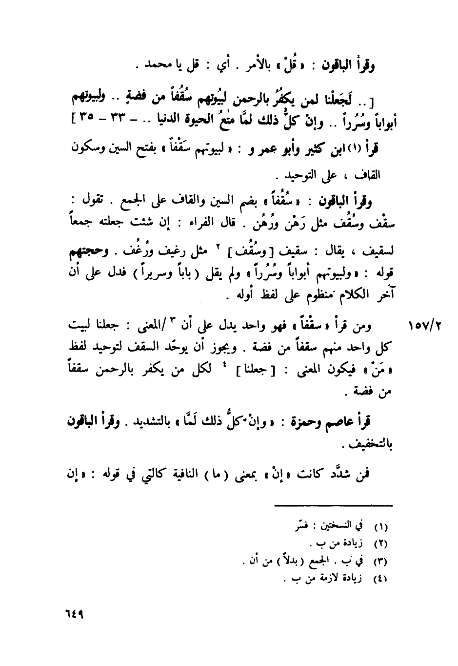 قَرَأَ ابْن كثير وَأَبُو عَمْرو {لبيوتهم} سقفا بِفَتْح السي وَسُكُون الْقَاف على التَّوْحِيد