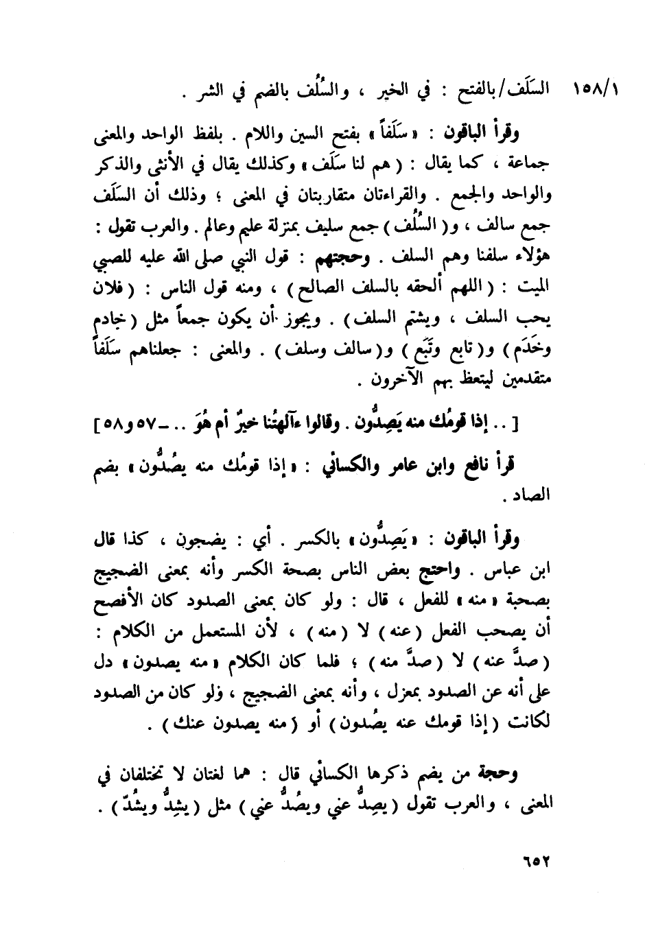 وَقَرَأَ الْبَاقُونَ {يصدون} بِالْكَسْرِ أَي يضجون كَذَا قَالَ ابْن عَبَّاس وَاحْتج بعض النَّاس بِصِحَّة الْكسر وَأَنه بِمَعْنى الضجيج بِصُحْبَة مِنْهُ للْفِعْل قَالَ وَلَو كَانَ بِمَعْنى الصدود كَانَ الْأَفْصَح أَن يصحب الْفِعْل عَنهُ لَا مِنْهُ لِأَن المتسعمل من الْكَلَام صد عَنهُ لَا صد مِنْهُ فَلَمَّا كَانَ الْكَلَام {مِنْهُ يصدون} دلّ على أَنه عَن الصدود بمعزل وَأَنه بِمَعْنى الضجيج وَلَو كَانَ من الصدود لكَانَتْ إِذا قَوْمك عَنهُ يصدون أَو مِنْهُ يصدون عَنْك