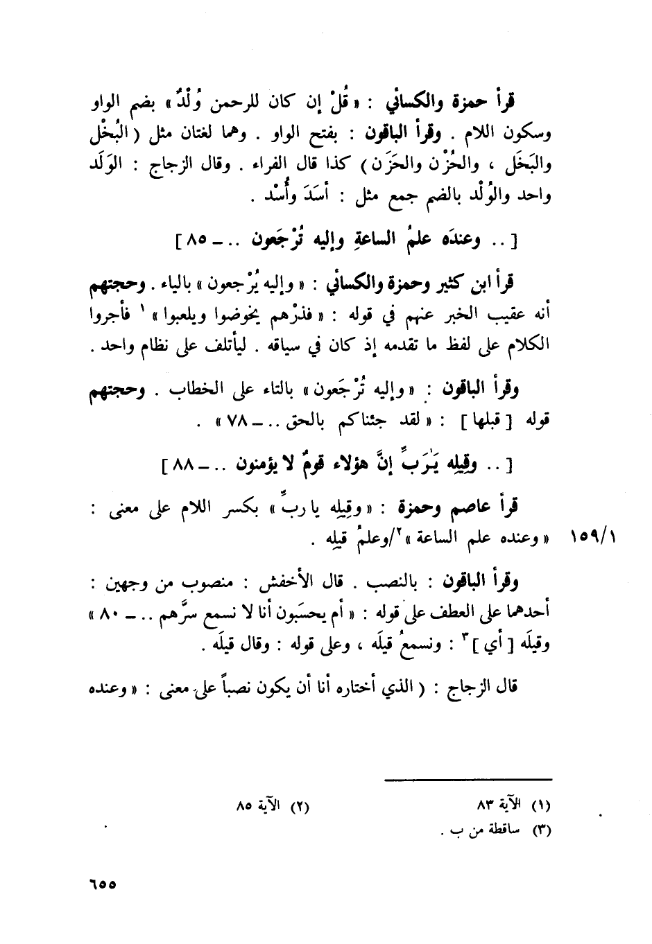 وَقَرَأَ الْبَاقُونَ {وَإِلَيْهِ ترجعون} بِالتَّاءِ على الْخطاب وحجتهم قَوْله قبلهَا {لقد جئناكم بِالْحَقِّ}