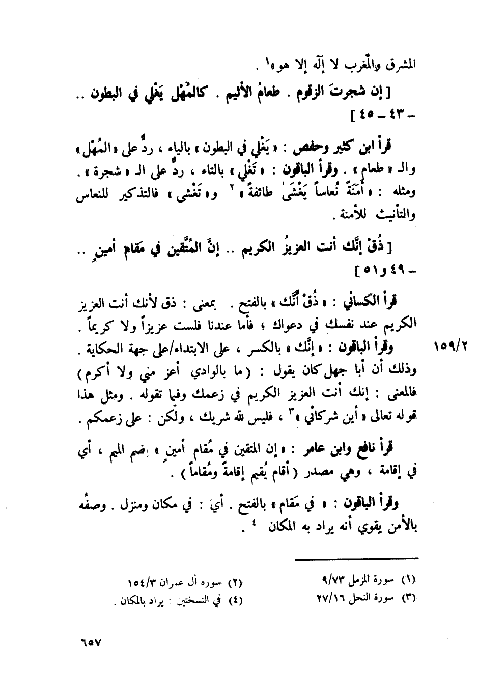 قَرَأَ ابْن كثير وَحَفْص {يغلي فِي الْبُطُون} بِالْيَاءِ رد على الْمهل وَال {طَعَام} وَقَرَأَ الْبَاقُونَ / تغلي / بِالتَّاءِ رد على ال {شَجَرَة} وَمثله {أَمَنَة نعاسا يغشى طَائِفَة} و / تغشى / فالتذكير للنعاس والتأنيث للأمنة