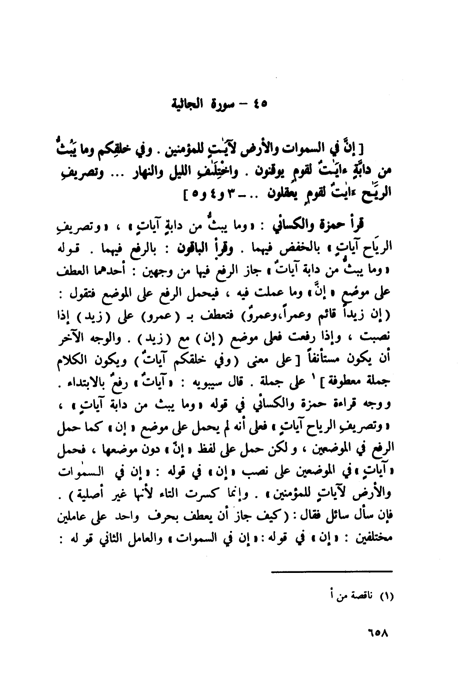قَرَأَ حَمْزَة وَالْكسَائِيّ {وَمَا يبث من دَابَّة آيَات} {وتصريف الرِّيَاح آيَات} بالخفض فيهمَا وَقَرَأَ الْبَاقُونَ بِالرَّفْع فيهمَا قَوْله {وَمَا يبث من دَابَّة آيَات} جَازَ الرّفْع فِيهَا من وَجْهَيْن أَحدهمَا الْعَطف على مَوضِع إِن وَمَا عملت فِيهِ فَيحمل الرّفْع على الْموضع فَتَقول إِن زيدا قَائِم وعمرا وَعَمْرو فتعطف ب عَمْرو على زيد إِذا نصبت وَإِذا رفعت فعلى مَوضِع إِن مَعَ زيد وَالْوَجْه الآخر أَن يكون مستأنفا على معنى وَفِي خَلقكُم آيَات وَيكون الْكَلَام جملَة معطوفة على جملَة قَالَ سِيبَوَيْهٍ {آيَات} رفع بِالِابْتِدَاءِ وَوجه قِرَاءَة حَمْزَة وَالْكسَائِيّ فِي قَوْله {وَمَا يبث من دَابَّة آيَات} {وتصريف الرِّيَاح آيَات} فعلى أَنه لم يحمل على مَوضِع إِن كَمَا حمل الرّفْع فِي الْمَوْضِعَيْنِ وَلَكِن حمل على لفظ إِن دون موضعهَا فَحمل آيَات فِي الْمَوْضِعَيْنِ على نصب إِن فِي قَوْله {إِن فِي السَّمَاوَات وَالْأَرْض لآيَات للْمُؤْمِنين} وَإِنَّمَا كسرت التَّاء لِأَنَّهَا غير أَصْلِيَّة فَإِن سَأَلَ سَائل فَقَالَ كَيفَ جَازَ أَن يعْطف بِحرف وَاحِد على عاملين مُخْتَلفين {إِن} فِي قَوْله {إِن فِي السَّمَاوَات} وَالْعَامِل الثَّانِي قَوْله