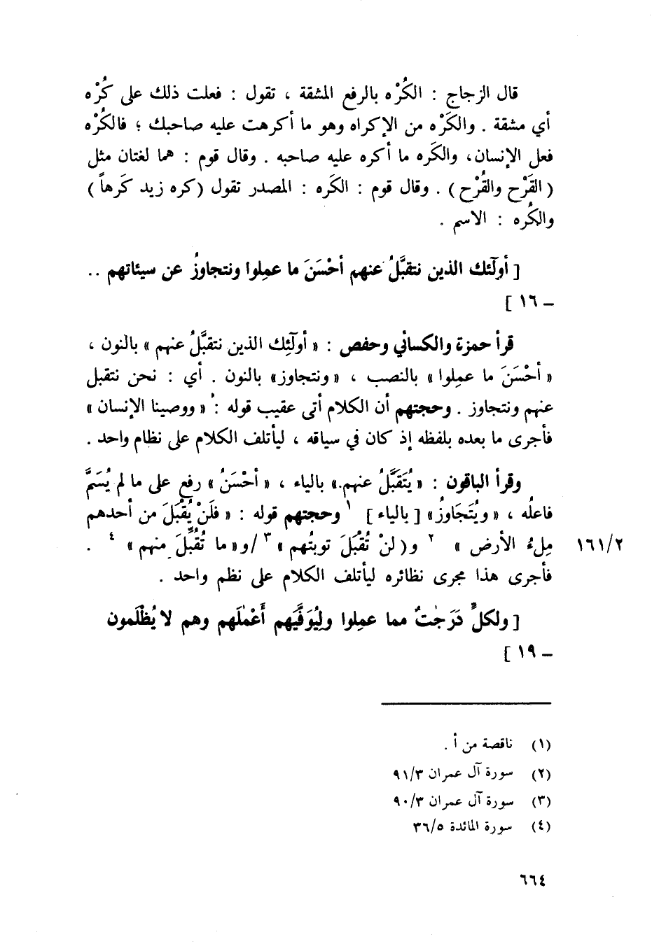 قَرَأَ حَمْزَة وَالْكسَائِيّ يوحفص {أُولَئِكَ الَّذين نتقبل عَنْهُم} بالنُّون {أحسن مَا عمِلُوا} بِالنّصب {ونتجاوز} بالنُّون أَي نَحن نتقبل عَنْهُم ونتجاوز وحجتهم أَن الْكَلَام أَتَى عقيب قَوْله وَوَصينَا الْإِنْسَان فَأجرى مَا بعده لَفظه إِذْ كَانَ فِي سِيَاقه ليأتلف الْكَلَام على نظام وَاحِد