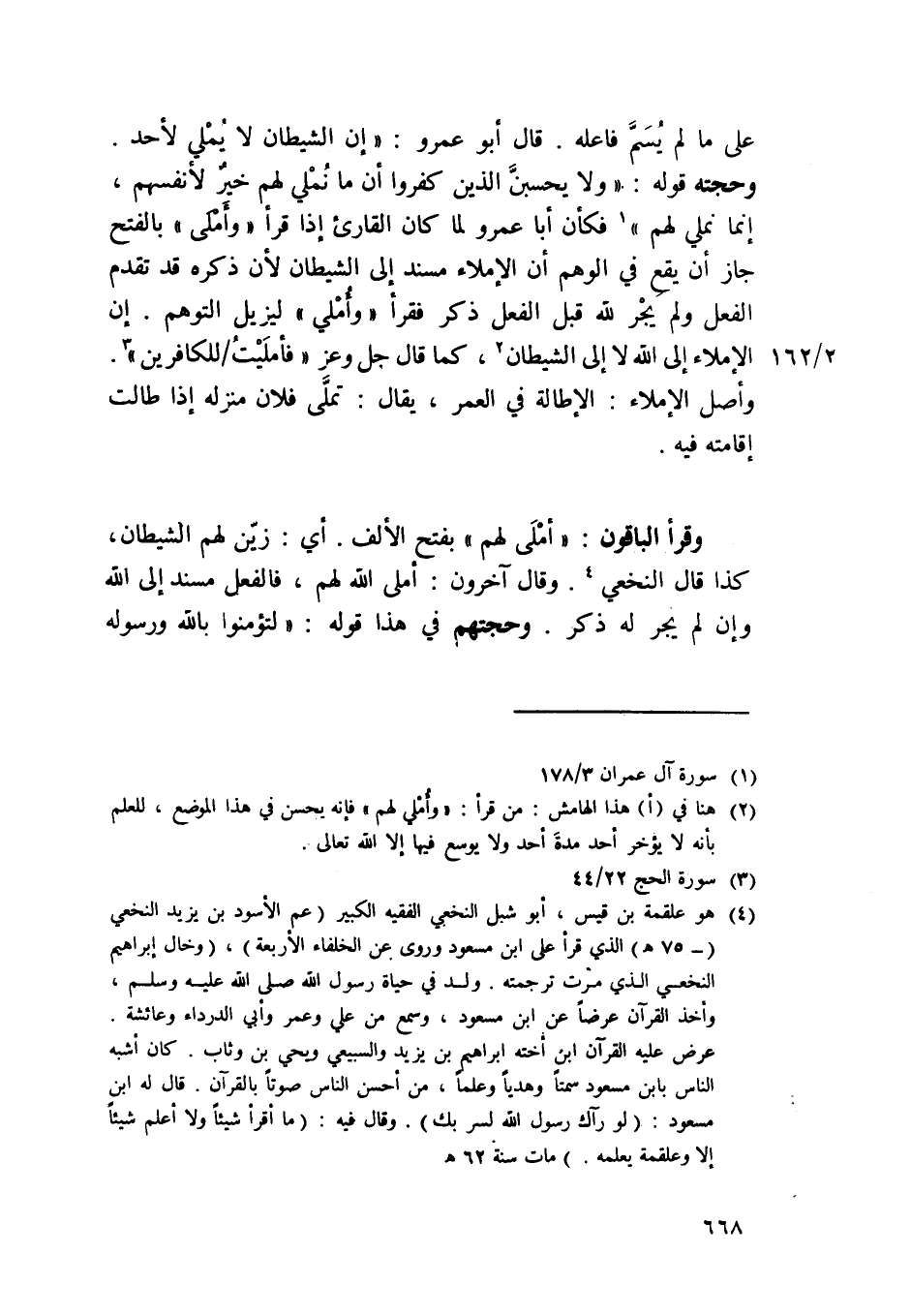 وَقَرَأَ الْبَاقُونَ / أمْلى لَهُم / بِفَتْح الْألف أَي زين لَهُم الشَّيْطَان كَذَا قَالَ النَّخعِيّ وَقَالَ آخَرُونَ أمْلى الله لَهُم فالفعل مُسْند إِلَى إِلَيْهِ وَإِن لم يجر لَهُ ذكر وحجتهم فِي هَذَا قَوْله {لتؤمنوا بِاللَّه وَرَسُوله وتعزروه وتوقروه وتسبحوه}