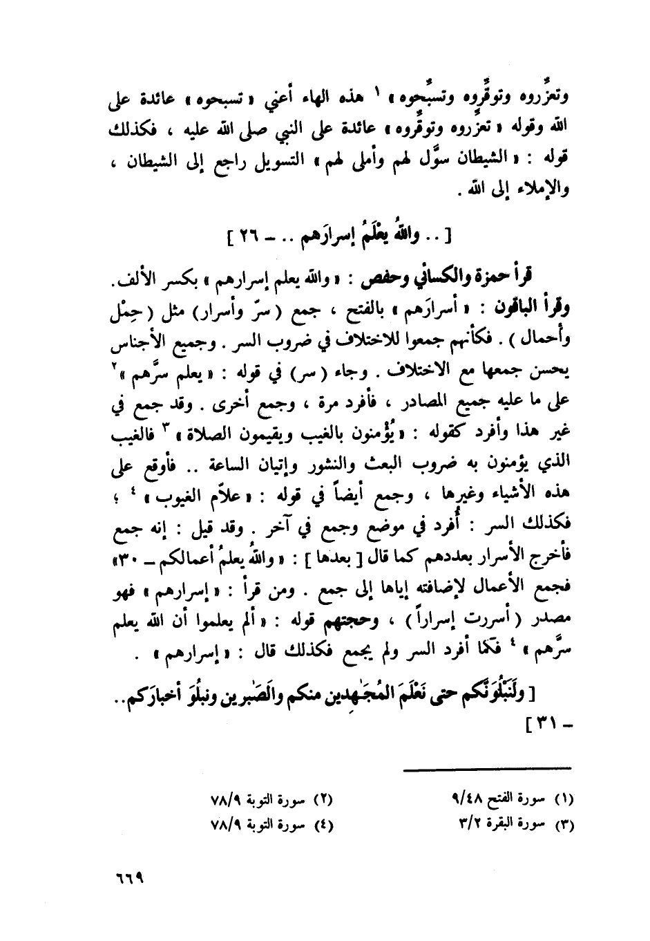 قَرَأَ حَمْزَة وَالْكسَائِيّ وَحَفْص {وَالله يعلم إسرارهم} بِكَسْر الْألف وَقَرَأَ الْبَاقُونَ {إسرارهم} بِالْفَتْح جمع سر وأسرار مثل حمل وأحمال فكأنهم جمعُوا للِاخْتِلَاف فِي ضروب السِّرّ وَجَمِيع الْأَجْنَاس يحسن جمعهَا مَعَ الِاخْتِلَاف وَجَاء سر فِي قَوْله {يعلم سرهم} على مَا عَلَيْهِ جَمِيع المصادر فأفرد مرّة وَجمع أُخْرَى وَقد جمع فِي غير هَذَا وأفرد كَقَوْلِه {يُؤمنُونَ بِالْغَيْبِ ويقيمون الصَّلَاة} فالغيب الَّذِي يُؤمنُونَ بِهِ ضروب الْبَعْث والنشور وإتيان السَّاعَة فأوقع على هَذِه الْأَشْيَاء وَغَيرهَا وَجمع أَيْضا فِي قَوْله {علام الغيوب} فَكَذَلِك السِّرّ أفرد فِي مَوضِع وَجمع فِي آخر وَقد قيل إِنَّه جمع فَأخْرج الْأَسْرَار بعددهم كَمَا قَالَ بعْدهَا {وَالله يعلم أَعمالكُم} فَجمع الْأَعْمَال لِإِضَافَتِهِ إِيَّاهَا إِلَى جمع وَمن قَرَأَ {إسرارهم} فَهُوَ مصدر أسررت إسرارا وحجتهم قَوْله {ألم يعلمُوا أَن الله يعلم سرهم} فَكَمَا أفرد السِّرّ وَلم يجمع فَكَذَلِك قَالَ {إسرارهم}